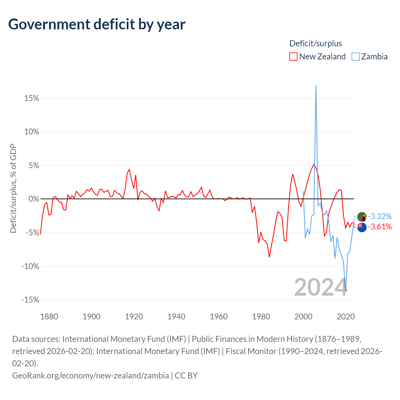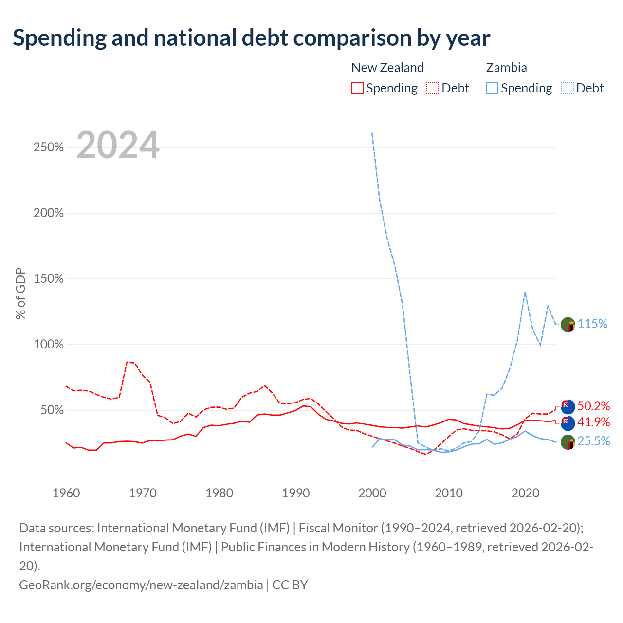 New Zealand has $131B in government debt (50.2% of GDP), compared to $29.1B (114.9% of GDP) in Zambia.