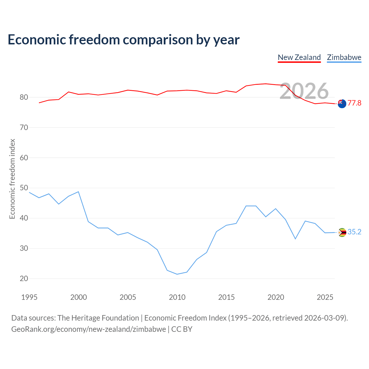 The Economic Freedom Index for New Zealand is 77.8, ranking 13/197, compared to 35.2 for Zimbabwe, ranking 190/197. The chart above displays a comparison of annual changes in economic freedom indexes.