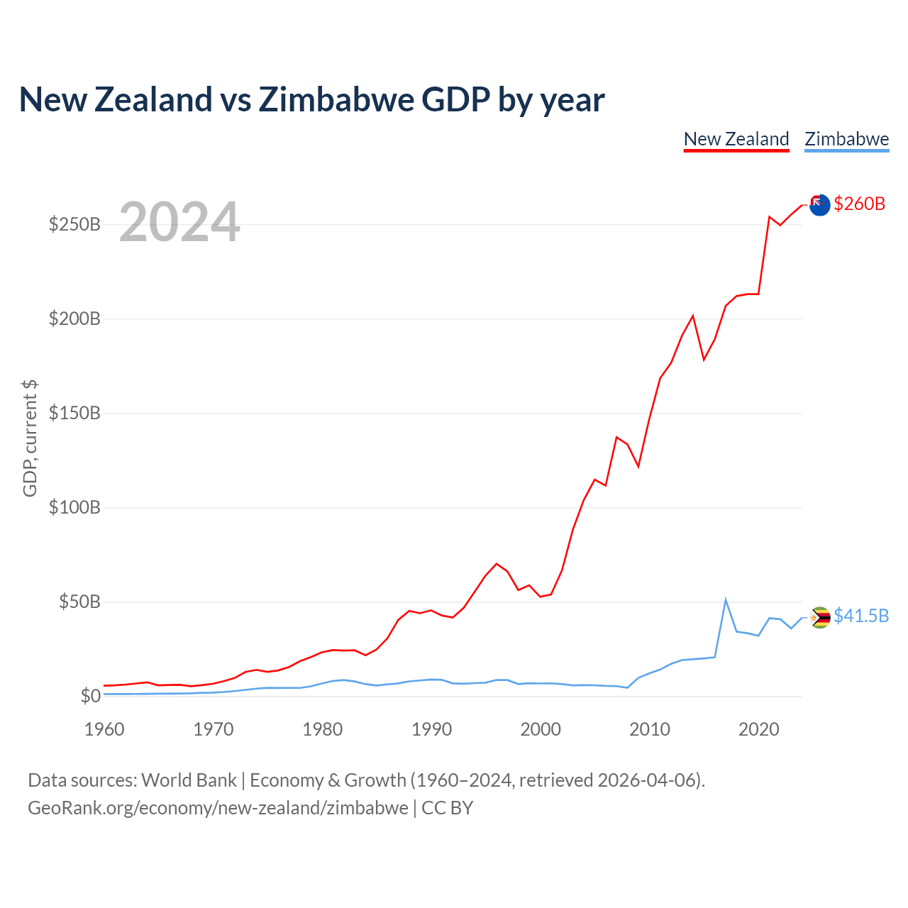 New Zealand has a GDP of $260B compared to $41.5B for Zimbabwe, ranking 52/197 and 102/197 by economy size, respectively.