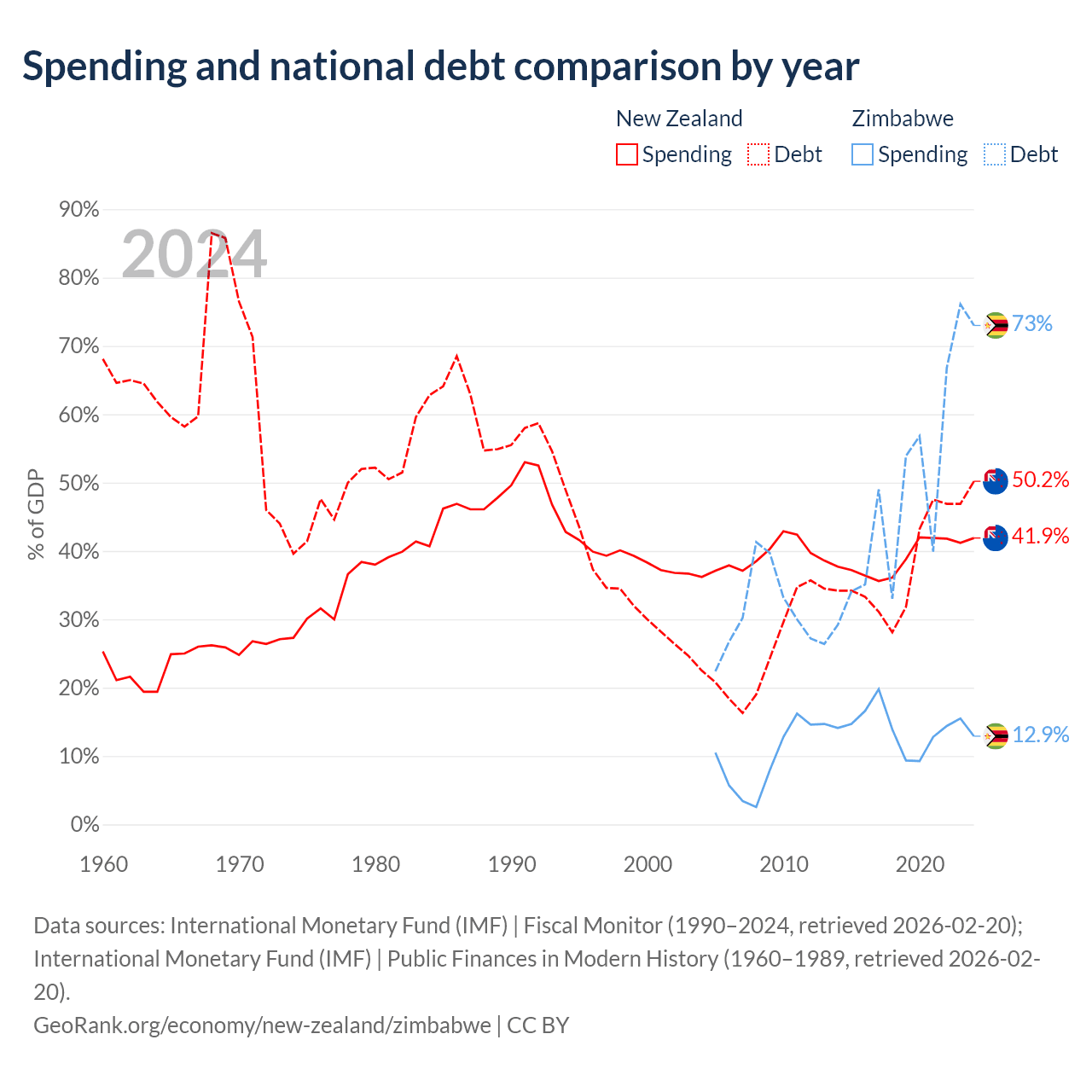 New Zealand has $131B in government debt (50.2% of GDP), compared to $30.3B (73% of GDP) in Zimbabwe.