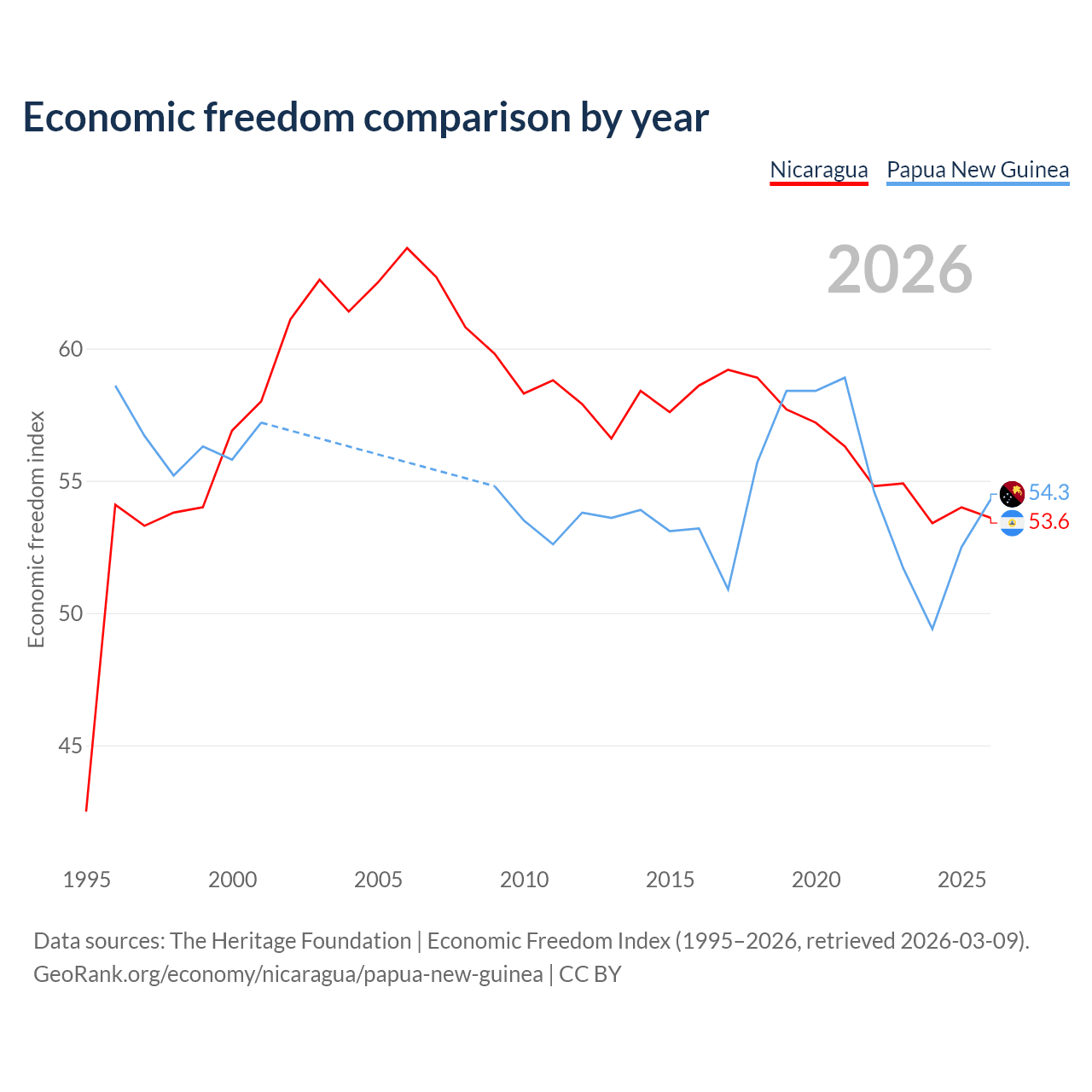 The Economic Freedom Index for Nicaragua is 53.6, ranking 139/197, compared to 54.3 for Papua New Guinea, ranking 134/197. The chart above displays a comparison of annual changes in economic freedom indexes.