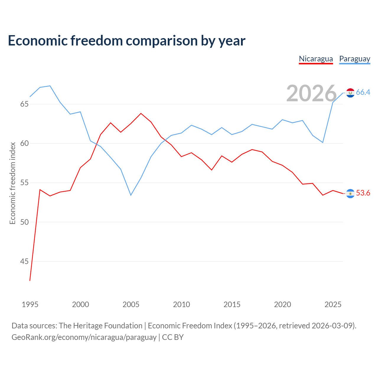 The Economic Freedom Index for Nicaragua is 53.6, ranking 139/197, compared to 66.4 for Paraguay, ranking 61/197. The chart above displays a comparison of annual changes in economic freedom indexes.