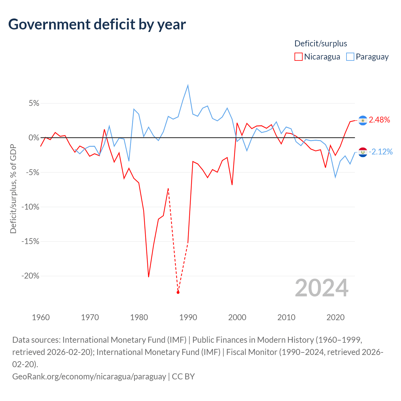 Nicaragua has a GDP of $19.7B compared to $44.5B for Paraguay, ranking 131/197 and 98/197 by economy size, respectively.
