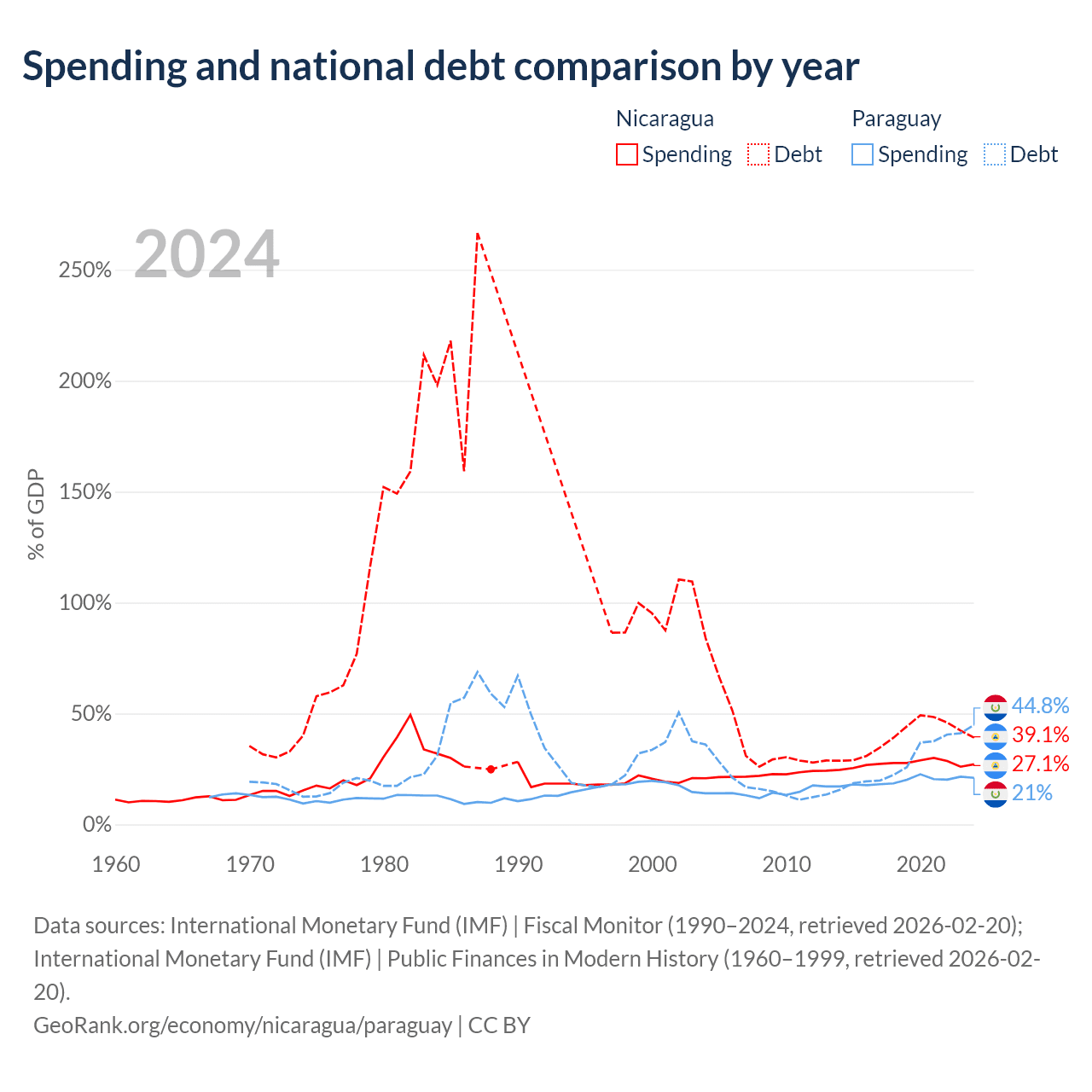 Nicaragua has $7.71B in government debt (39.1% of GDP), compared to $19.9B (44.8% of GDP) in Paraguay.