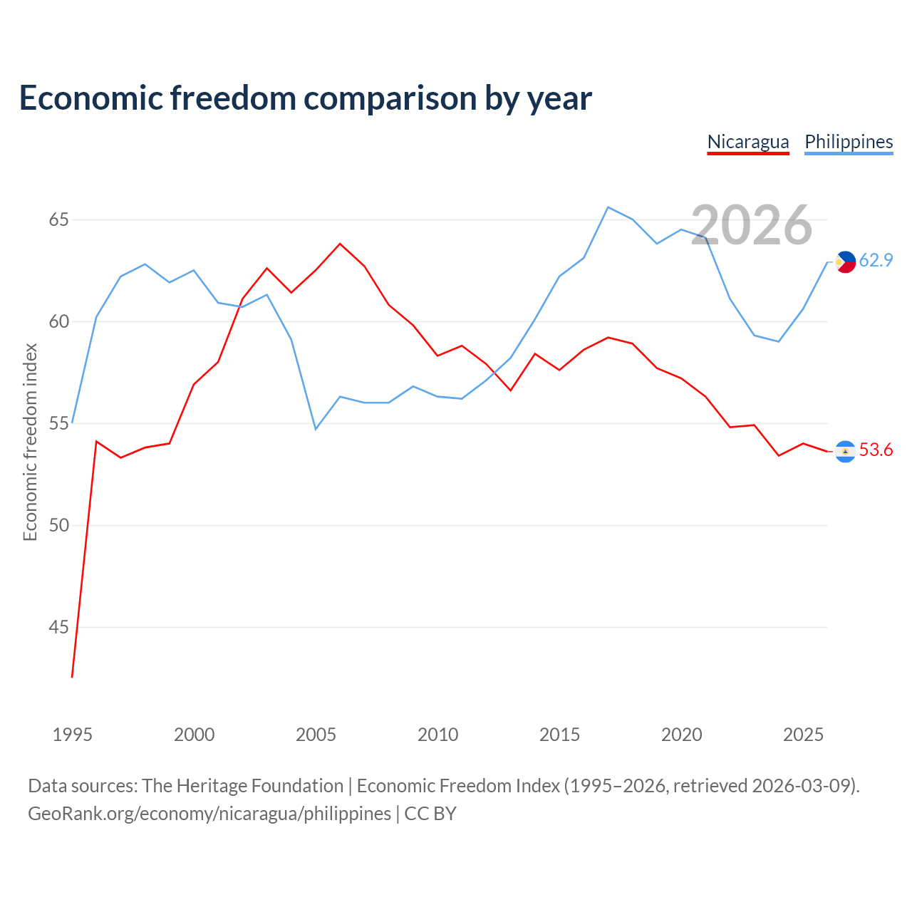 Data sources: The Heritage Foundation | Economic Freedom Index (1995–2026, retrieved 2026-03-09).