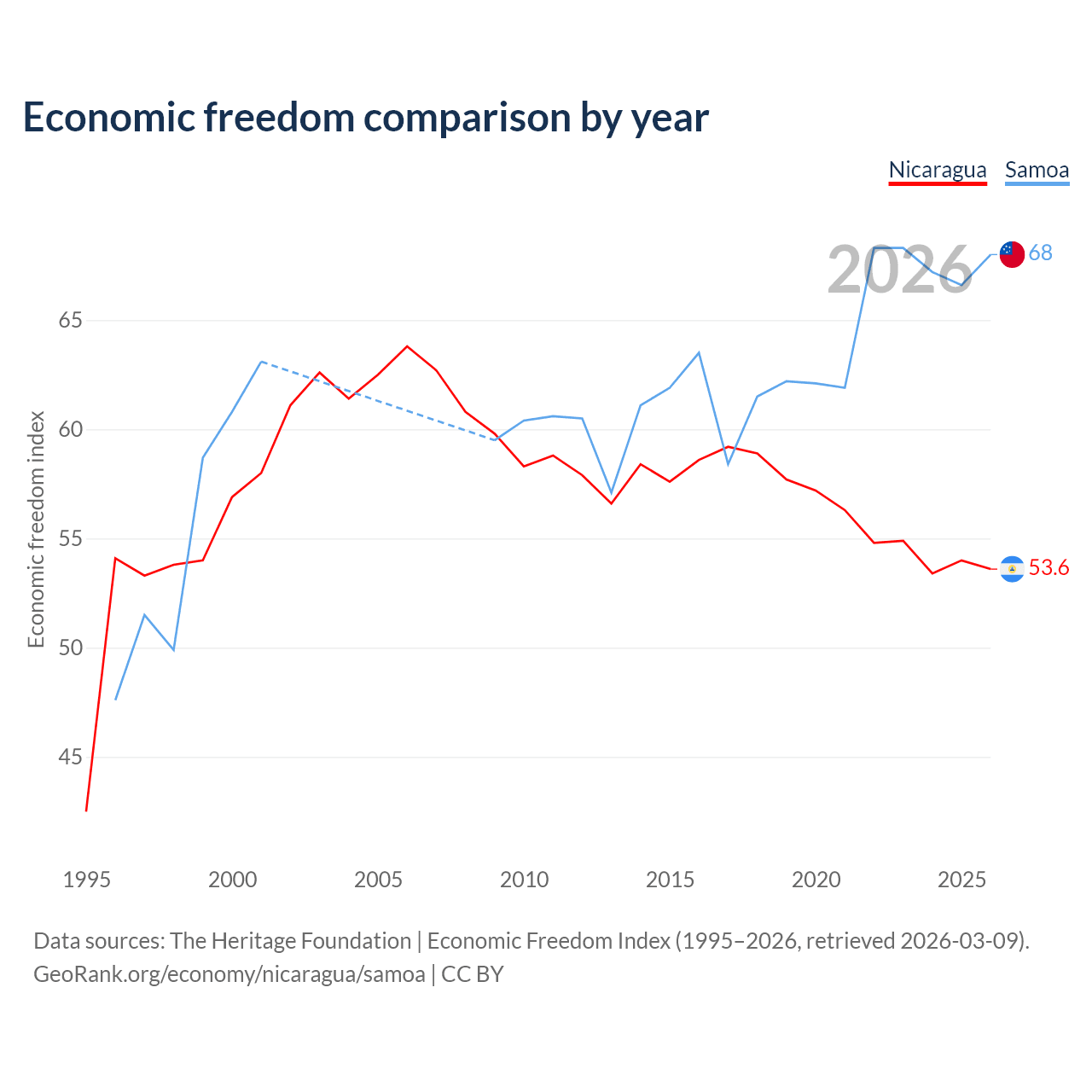 The Economic Freedom Index for Nicaragua is 53.6, ranking 139/197, compared to 68 for Samoa, ranking 52/197. The chart above displays a comparison of annual changes in economic freedom indexes.
