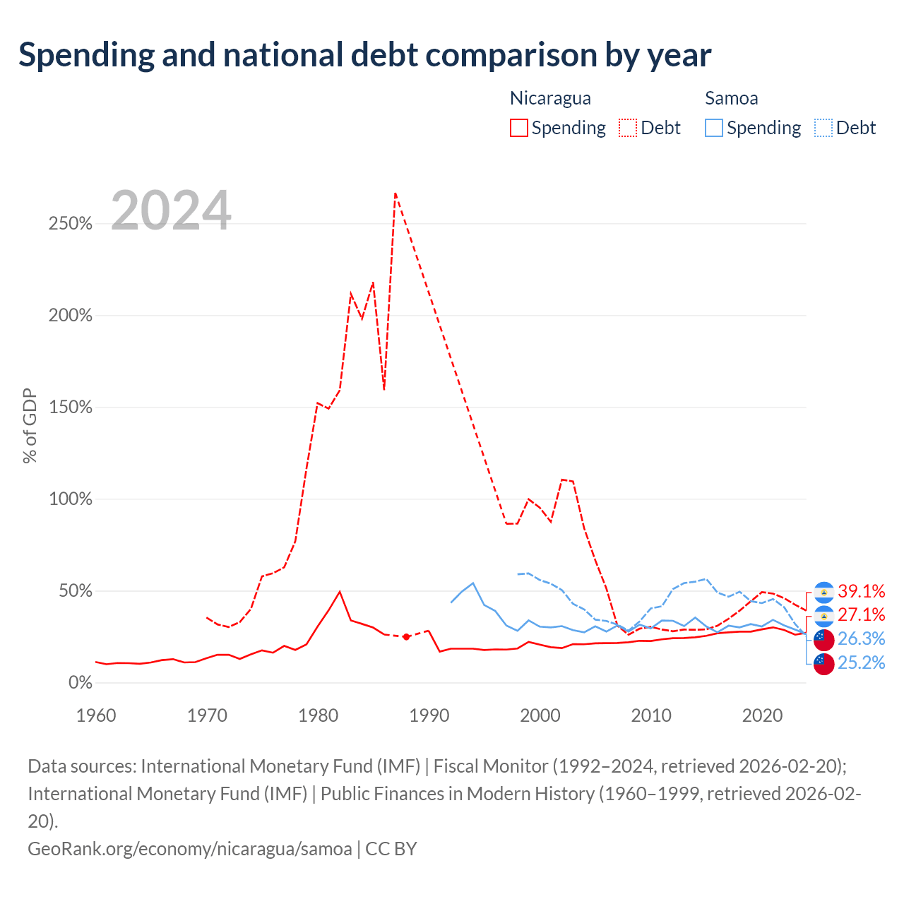 Nicaragua has $7.71B in government debt (39.1% of GDP), compared to $296M (25.2% of GDP) in Samoa.