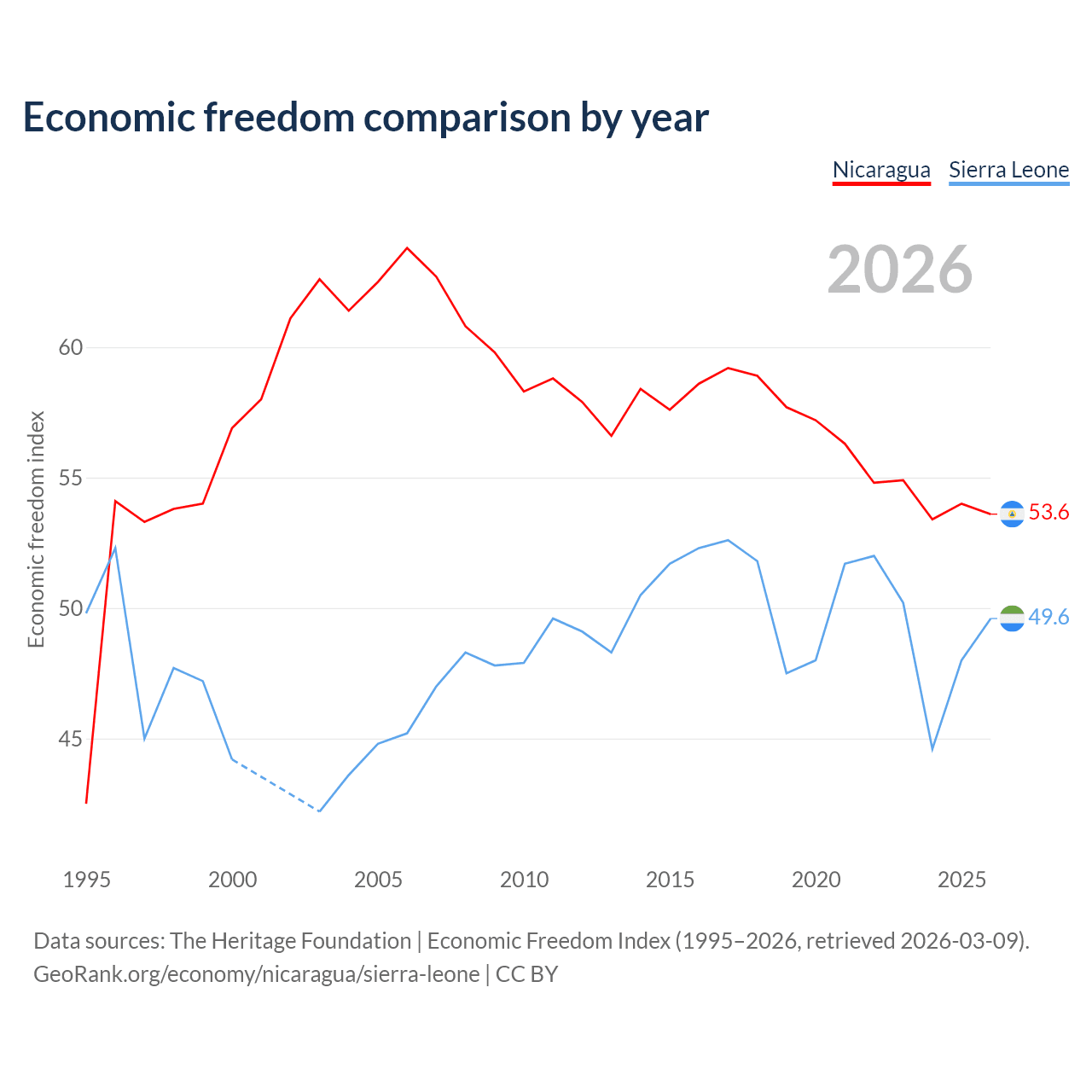 The Economic Freedom Index for Nicaragua is 53.6, ranking 139/197, compared to 49.6 for Sierra Leone, ranking 165/197. The chart above displays a comparison of annual changes in economic freedom indexes.