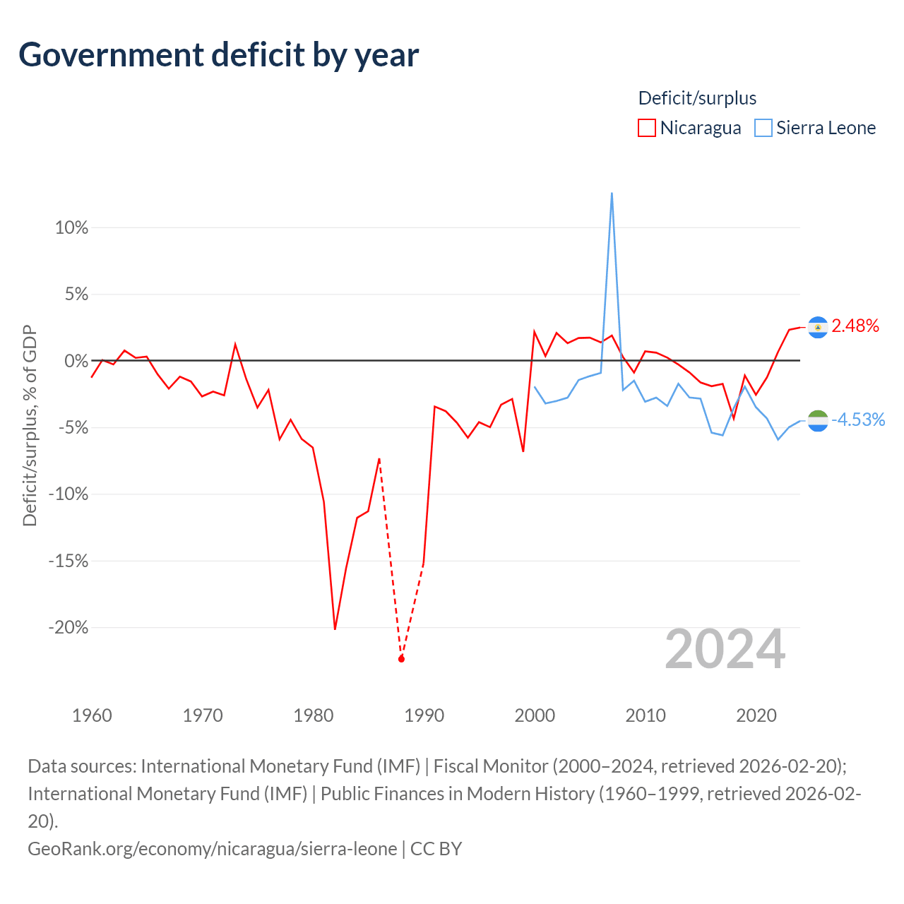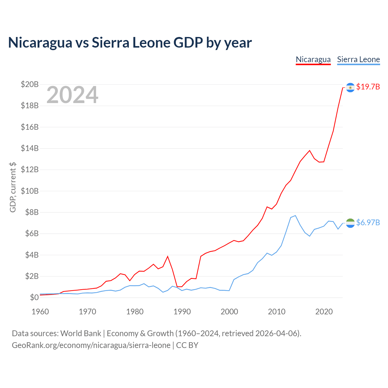 Nicaragua has a GDP of $19.7B compared to $6.97B for Sierra Leone, ranking 131/197 and 160/197 by economy size, respectively.