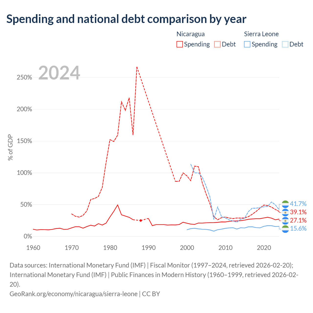 Nicaragua has $7.71B in government debt (39.1% of GDP), compared to $2.91B (41.7% of GDP) in Sierra Leone.