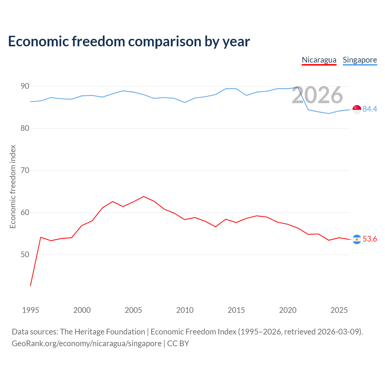 The Economic Freedom Index for Nicaragua is 53.6, ranking 139/197, compared to 84.4 for Singapore, ranking 1/197. The chart above displays a comparison of annual changes in economic freedom indexes.