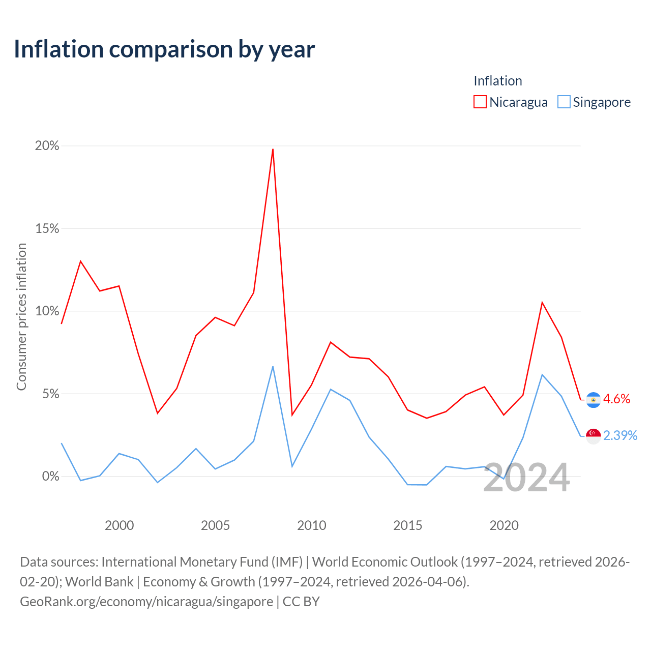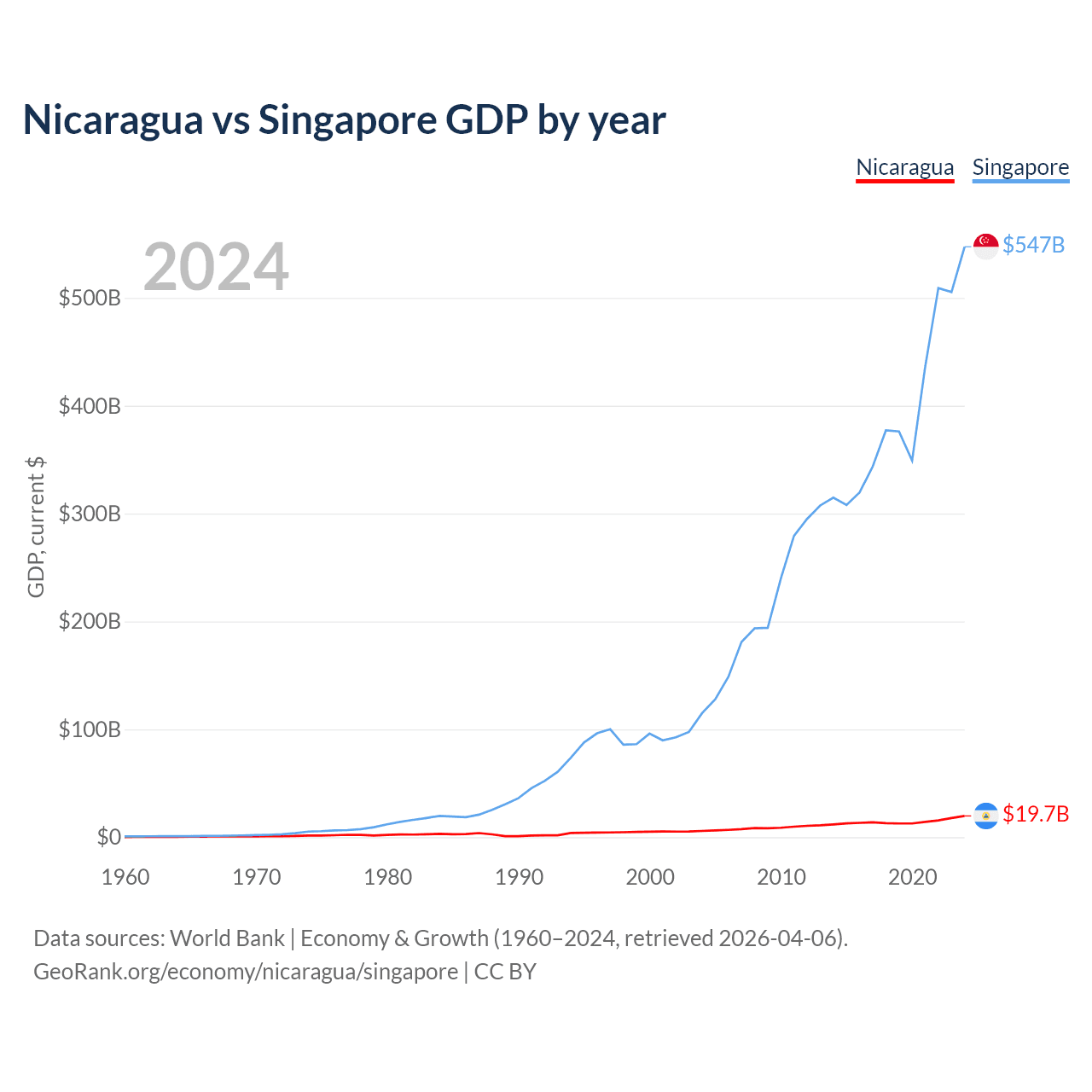 Nicaragua has a GDP of $19.7B compared to $547B for Singapore, ranking 131/197 and 28/197 by economy size, respectively.