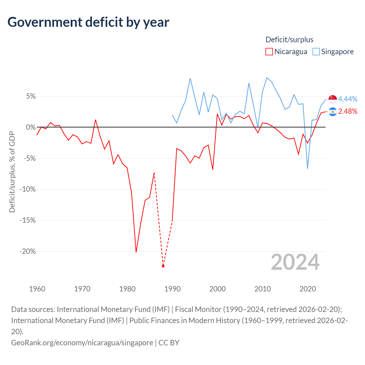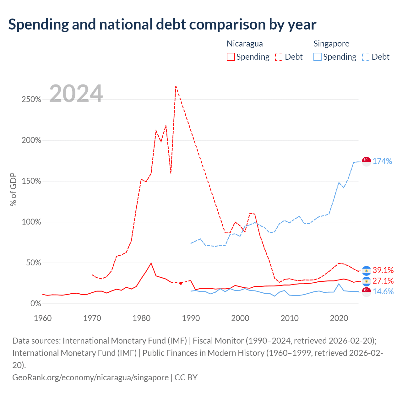 Nicaragua has $7.71B in government debt (39.1% of GDP), compared to $950B (173.5% of GDP) in Singapore.