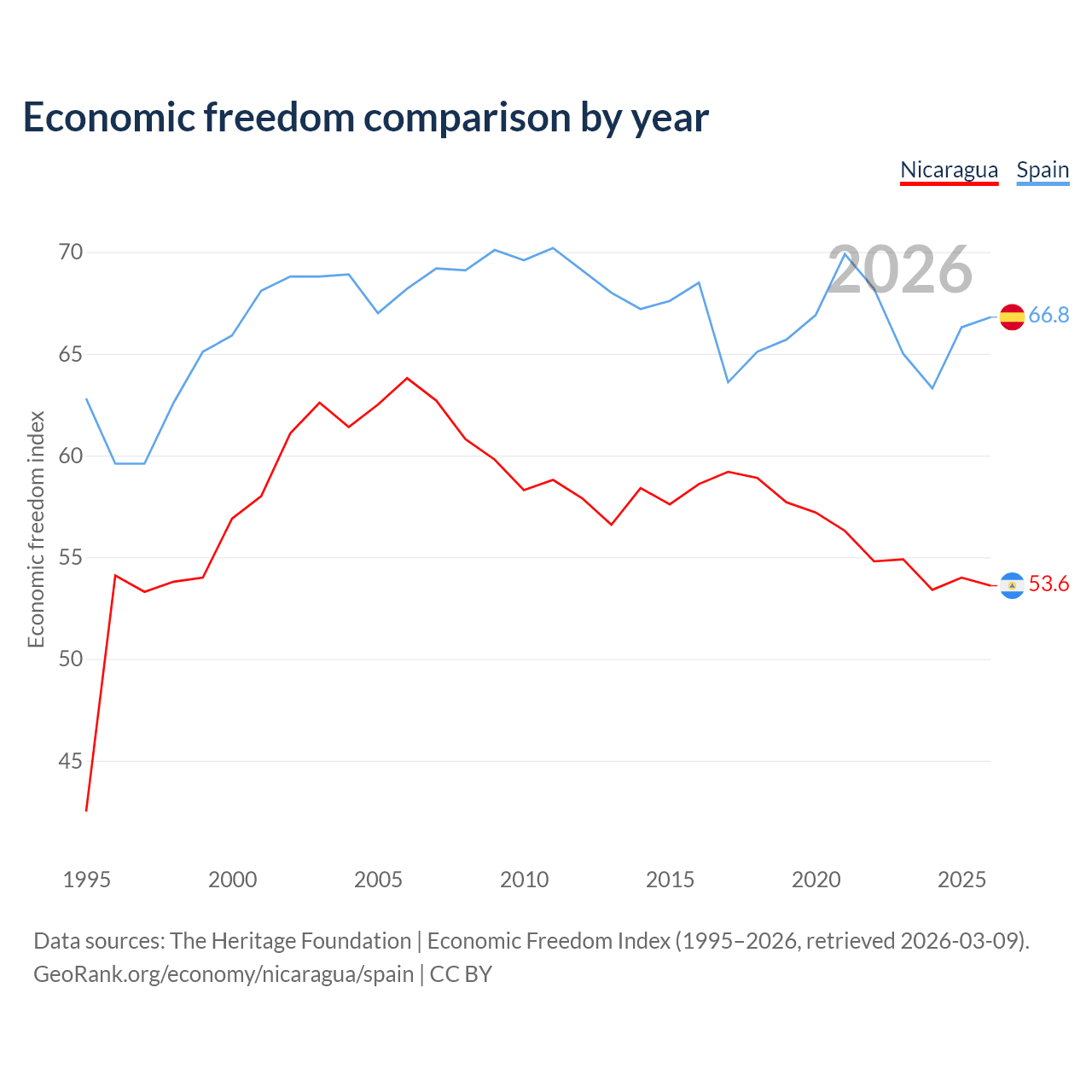 The Economic Freedom Index for Nicaragua is 53.6, ranking 139/197, compared to 66.8 for Spain, ranking 59/197. The chart above displays a comparison of annual changes in economic freedom indexes.