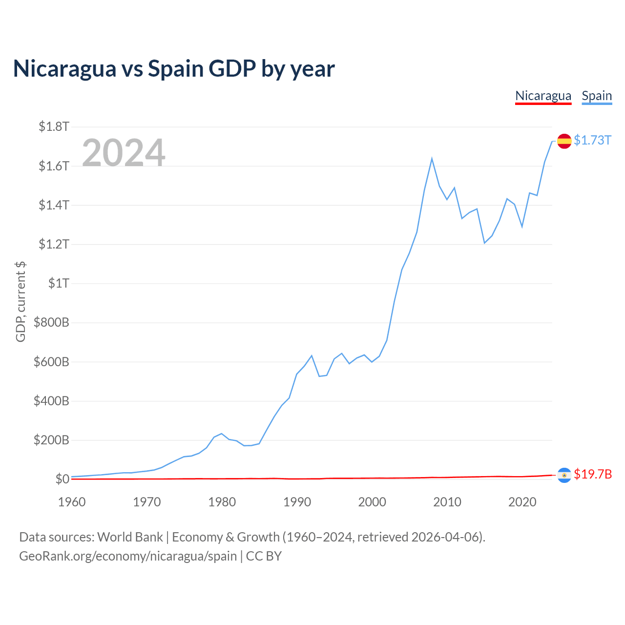Nicaragua has a GDP of $19.7B compared to $1.73T for Spain, ranking 131/197 and 15/197 by economy size, respectively.