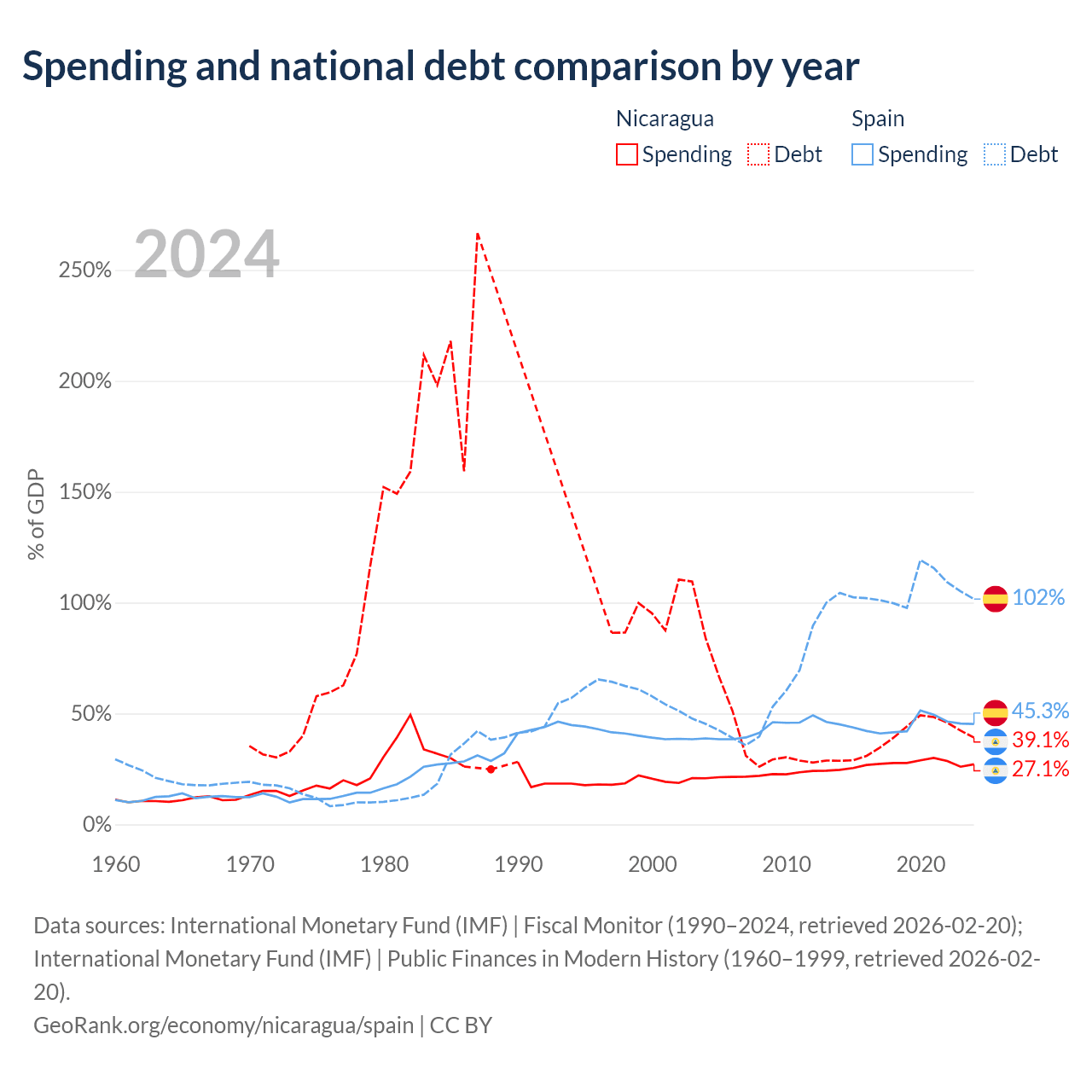 Nicaragua has $7.71B in government debt (39.1% of GDP), compared to $1.75T (101.6% of GDP) in Spain.