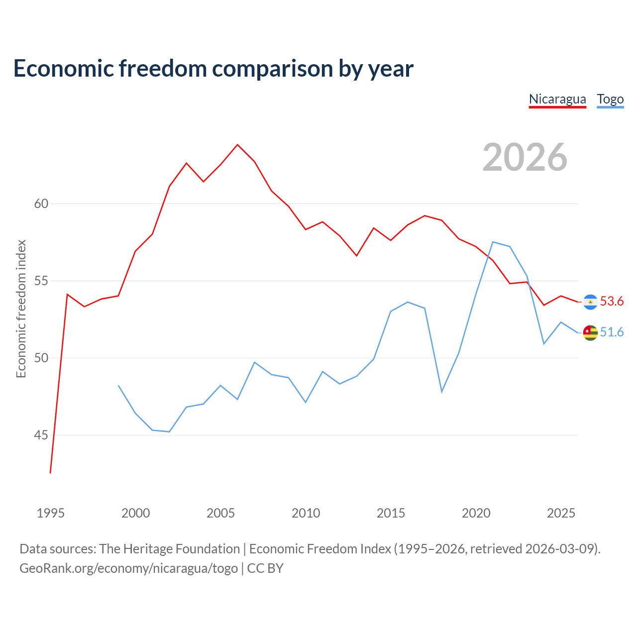 The Economic Freedom Index for Nicaragua is 53.6, ranking 139/197, compared to 51.6 for Togo, ranking 153/197. The chart above displays a comparison of annual changes in economic freedom indexes.