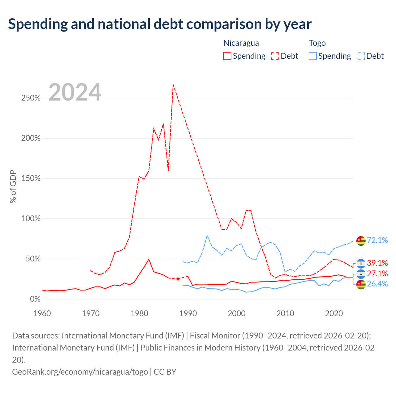 Nicaragua has $7.71B in government debt (39.1% of GDP), compared to $7.68B (72.1% of GDP) in Togo.