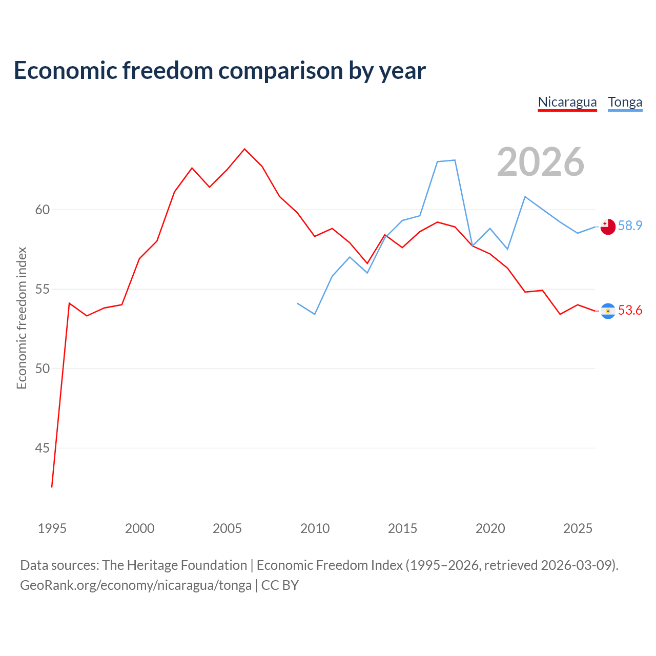 The Economic Freedom Index for Nicaragua is 53.6, ranking 139/197, compared to 58.9 for Tonga, ranking 107/197. The chart above displays a comparison of annual changes in economic freedom indexes.