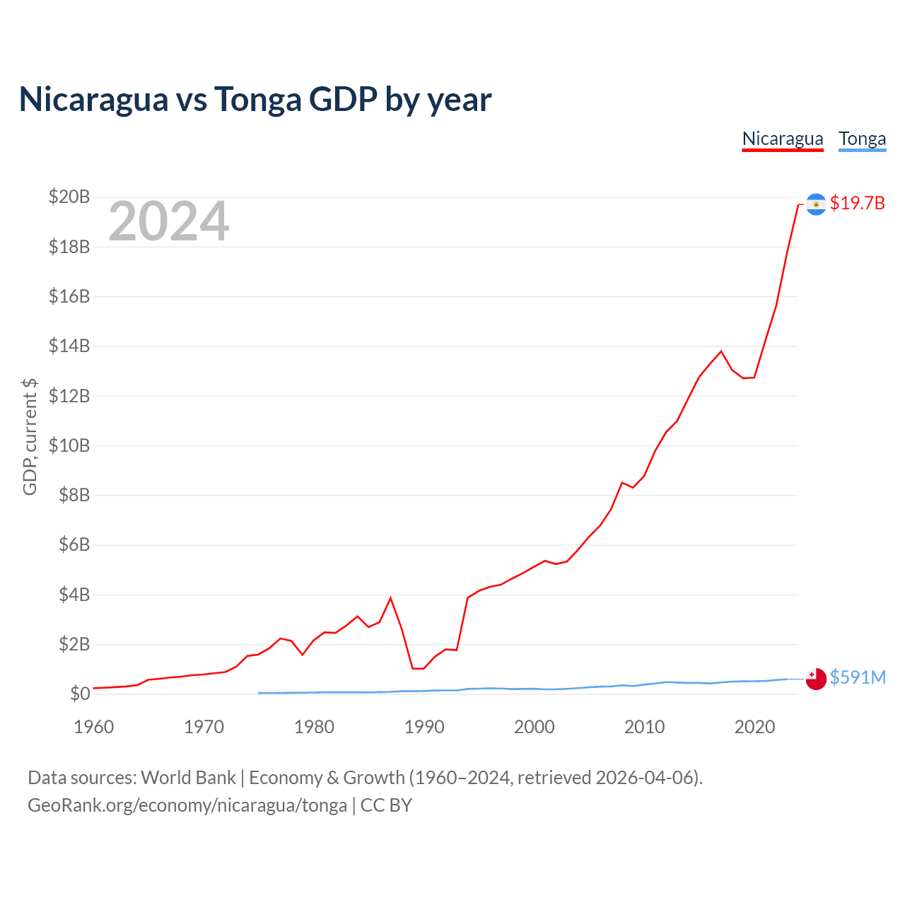 Nicaragua has a GDP of $19.7B compared to $591M for Tonga, ranking 131/197 and 191/197 by economy size, respectively.