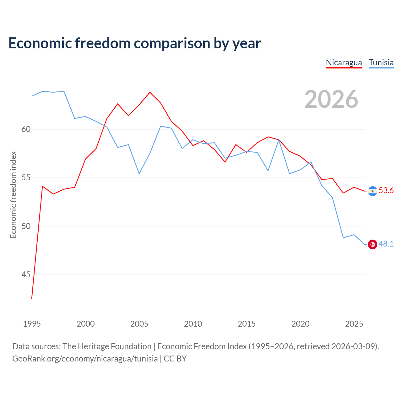 Data sources: The Heritage Foundation | Economic Freedom Index (1995–2026, retrieved 2026-03-09).