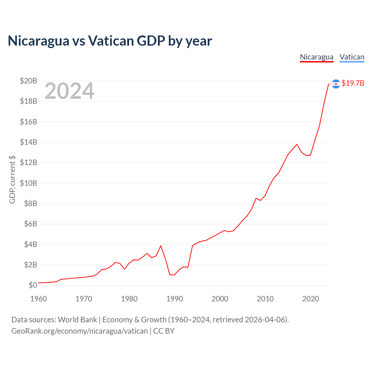 Nicaragua has a GDP of $19.7B compared to $19.8M for the Vatican, ranking 131/197 and 197/197 by economy size, respectively.