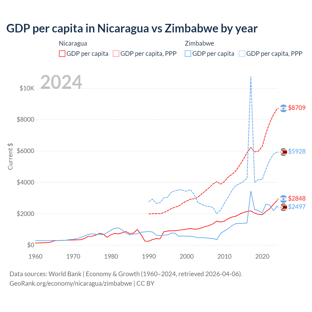 GDP per capita in Nicaragua vs Zimbabwe by year