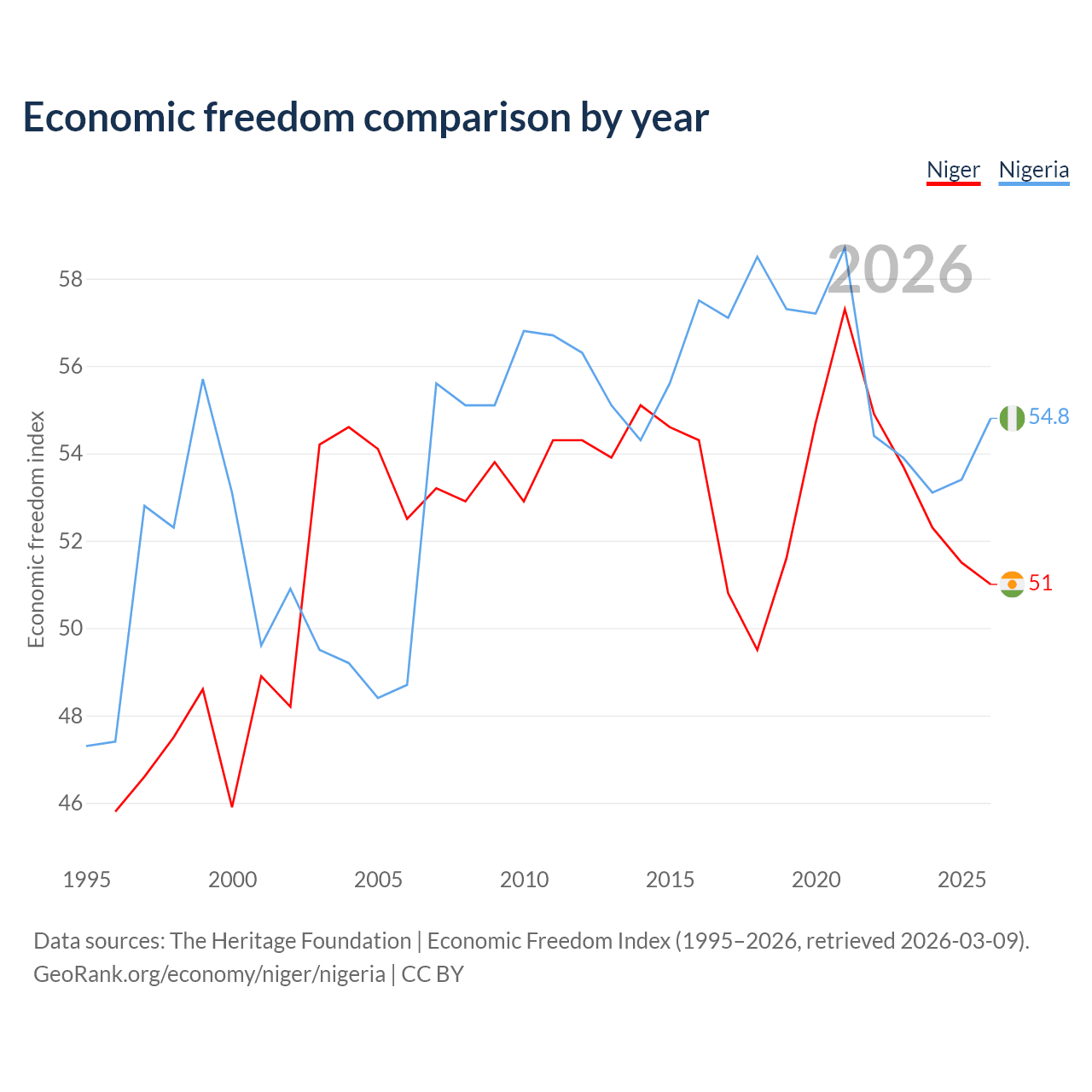The Economic Freedom Index for Niger is 51, ranking 156/197, compared to 54.8 for Nigeria, ranking 132/197. The chart above displays a comparison of annual changes in economic freedom indexes.