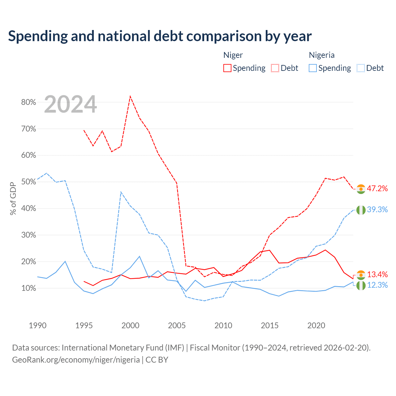 Niger has $9.39B in government debt (47.2% of GDP), compared to $99.2B (39.3% of GDP) in Nigeria.