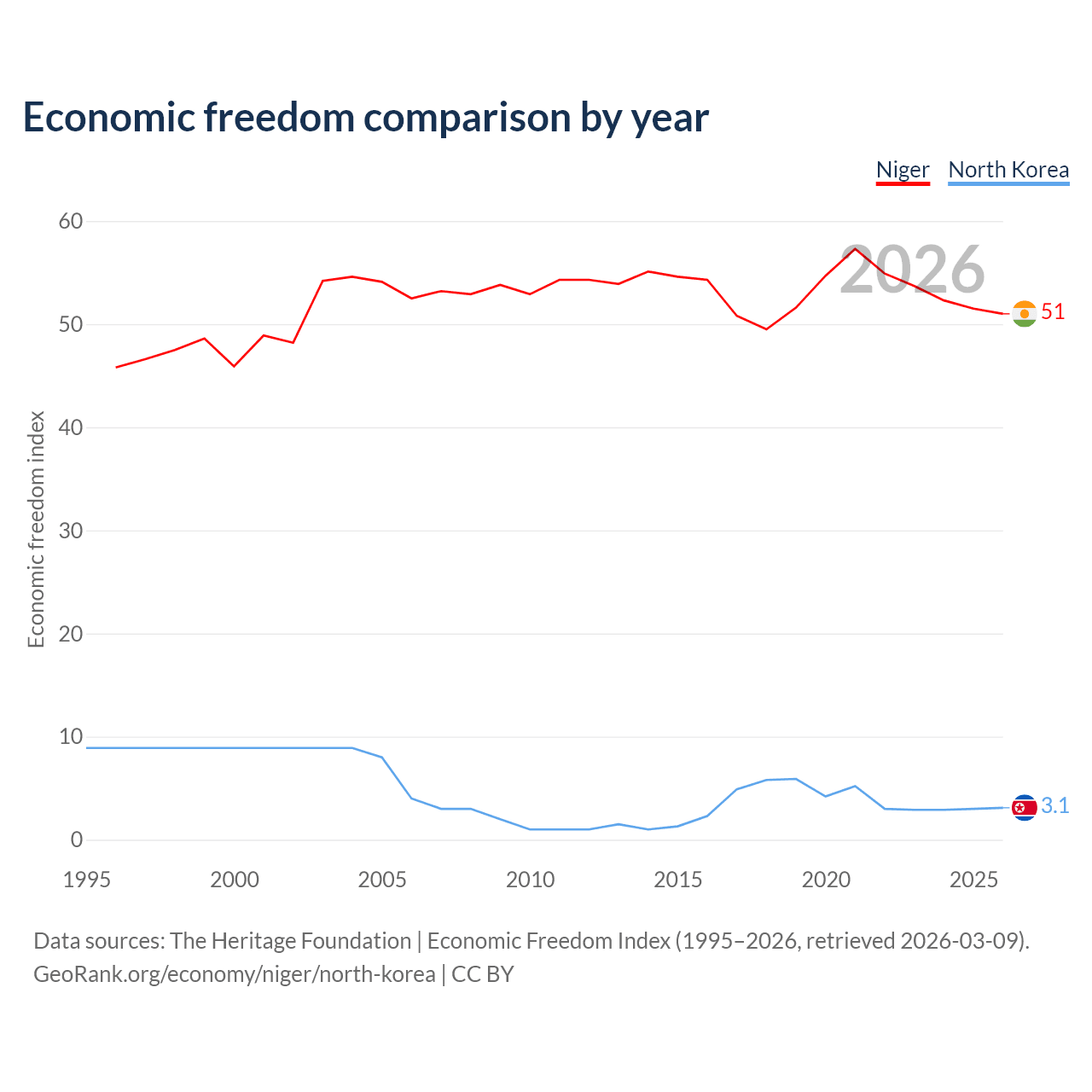 The Economic Freedom Index for Niger is 51, ranking 156/197, compared to 3.1 for North Korea, ranking 197/197. The chart above displays a comparison of annual changes in economic freedom indexes.