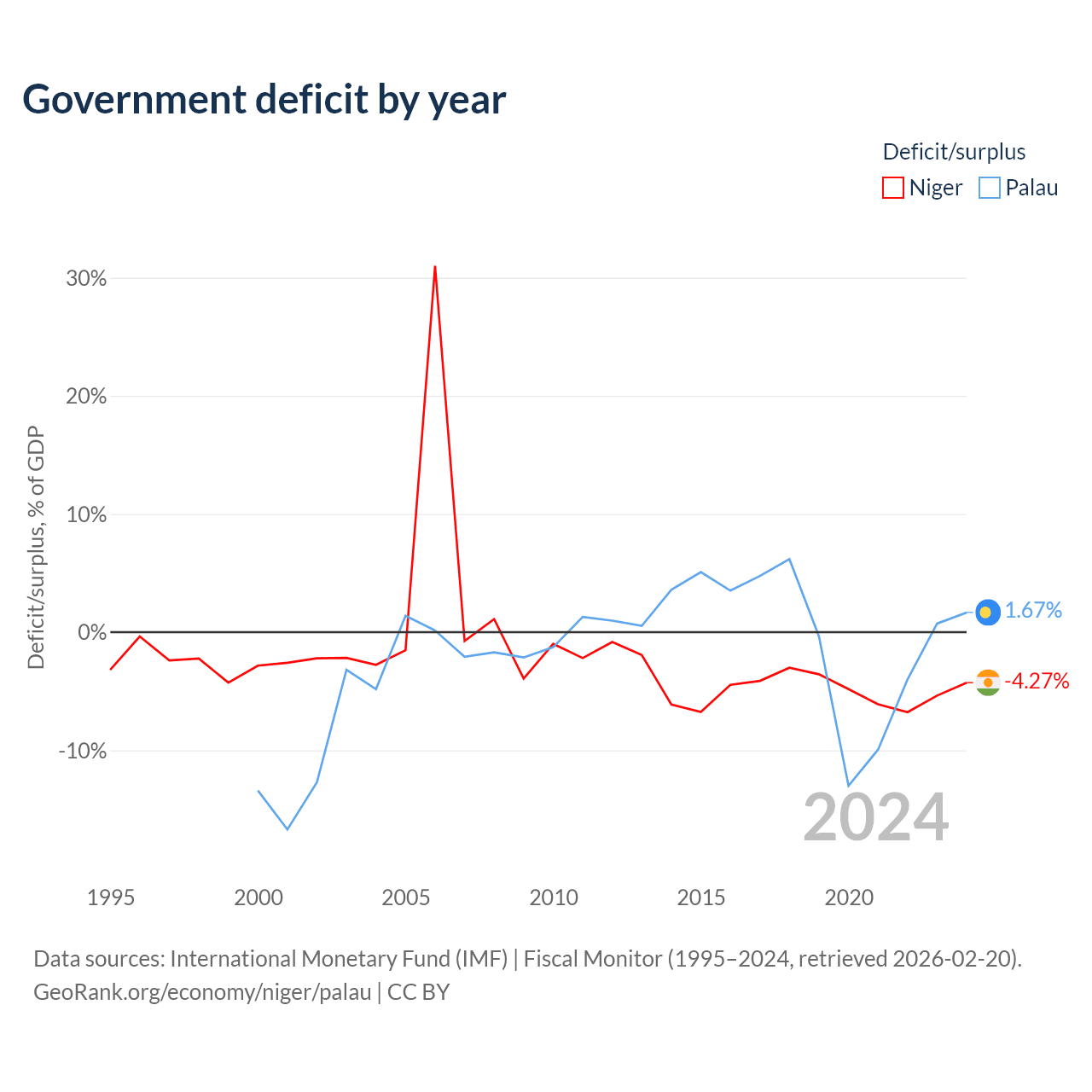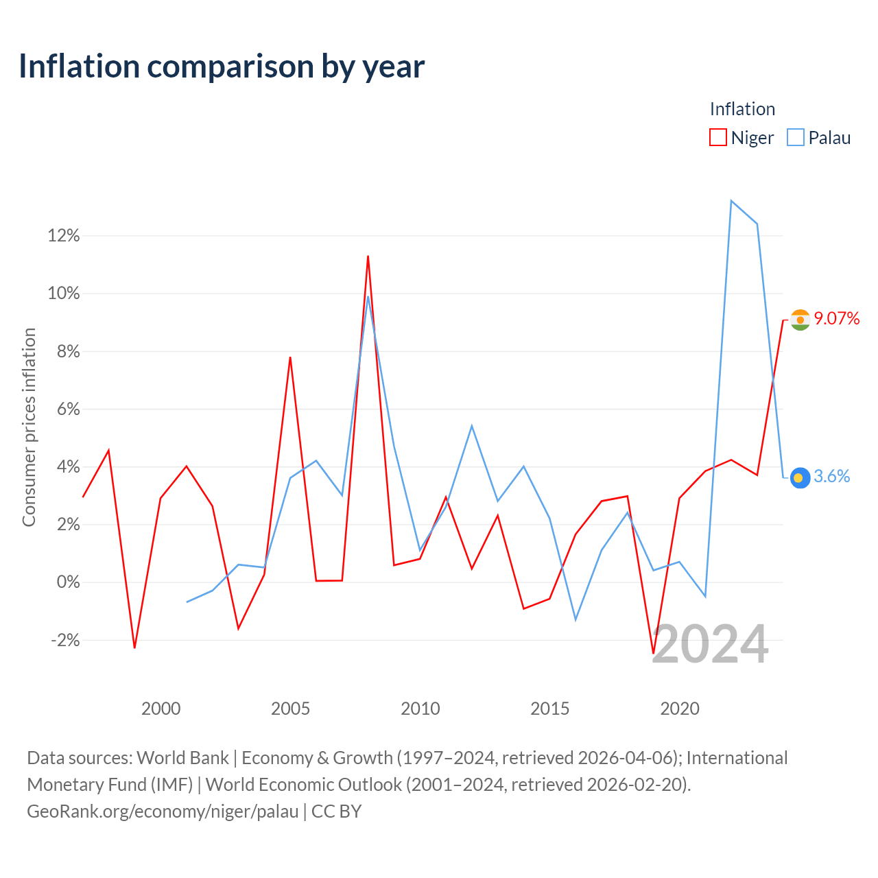 Over the past 24 years, Niger has recorded an average annual inflation rate of 2.45%, compared with 3.15% in Palau. In 2024, inflation was 9.07% in Niger and 3.6% in Palau.