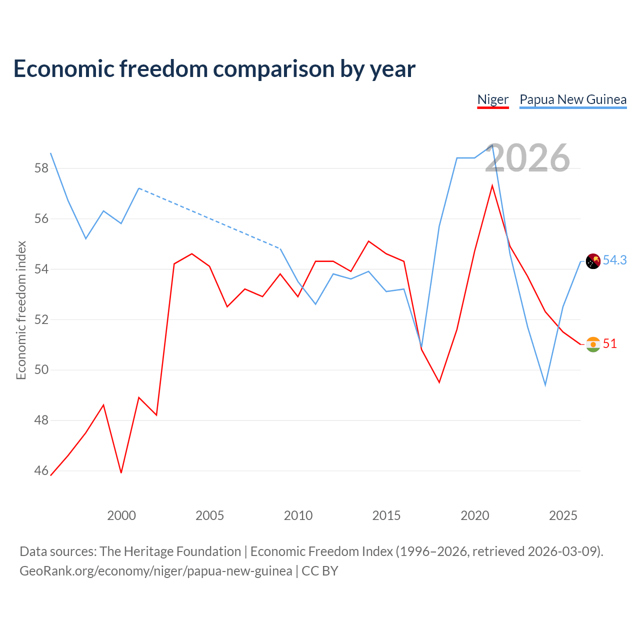The Economic Freedom Index for Niger is 51, ranking 156/197, compared to 54.3 for Papua New Guinea, ranking 134/197. The chart above displays a comparison of annual changes in economic freedom indexes.
