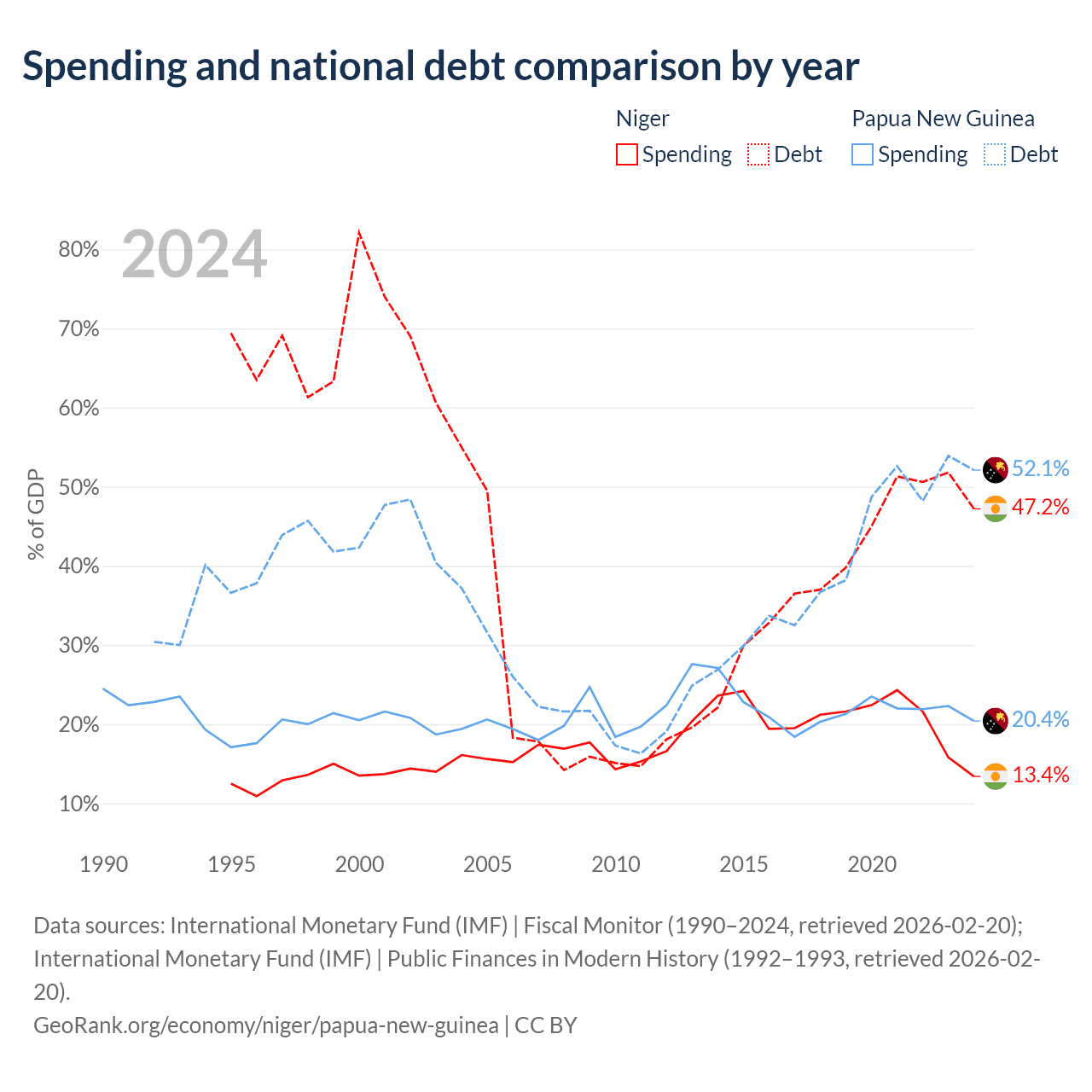 Niger has $9.39B in government debt (47.2% of GDP), compared to $16.6B (52.1% of GDP) in Papua New Guinea.