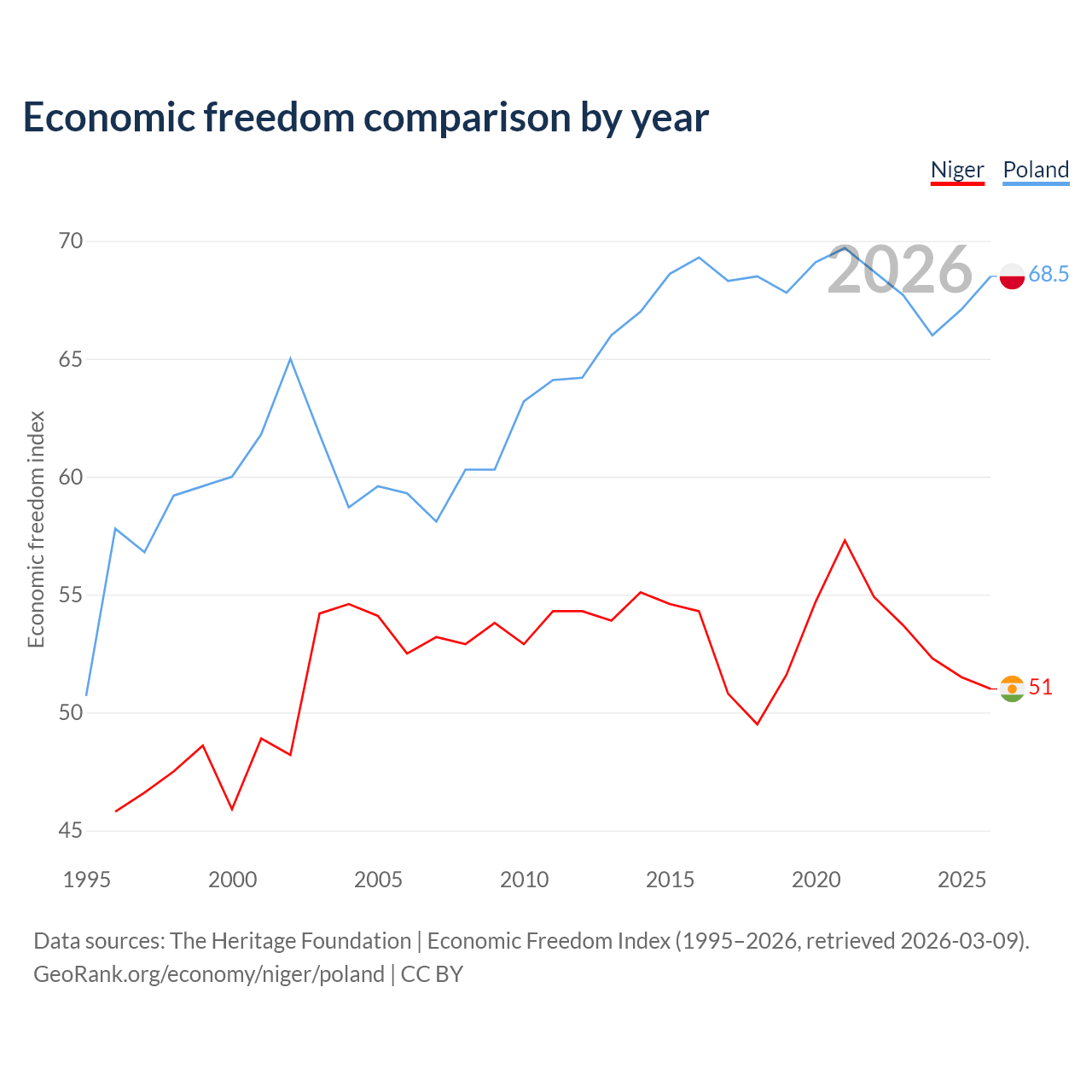 The Economic Freedom Index for Niger is 51, ranking 156/197, compared to 68.5 for Poland, ranking 46/197. The chart above displays a comparison of annual changes in economic freedom indexes.
