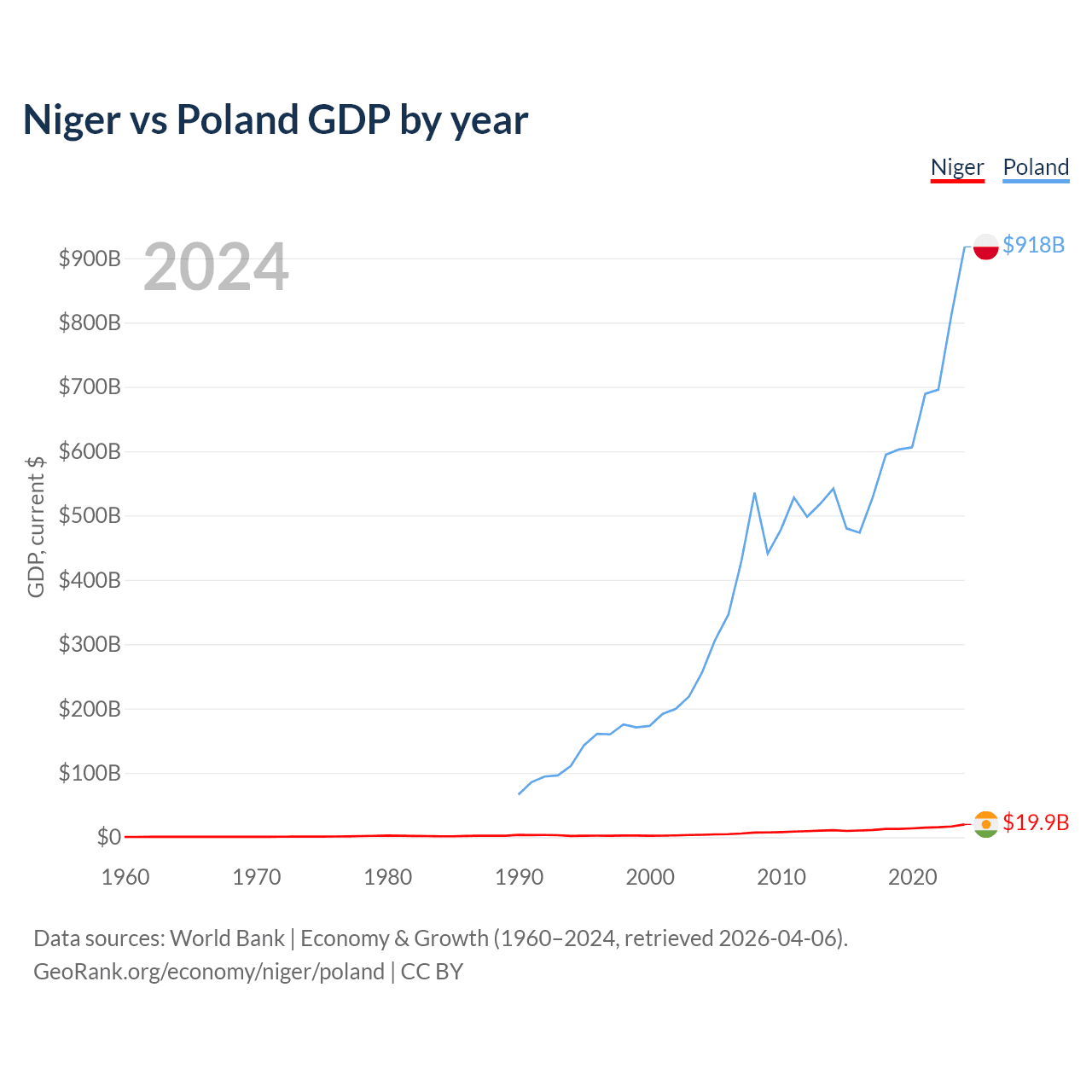 Niger has a GDP of $19.9B compared to $918B for Poland, ranking 130/197 and 21/197 by economy size, respectively.