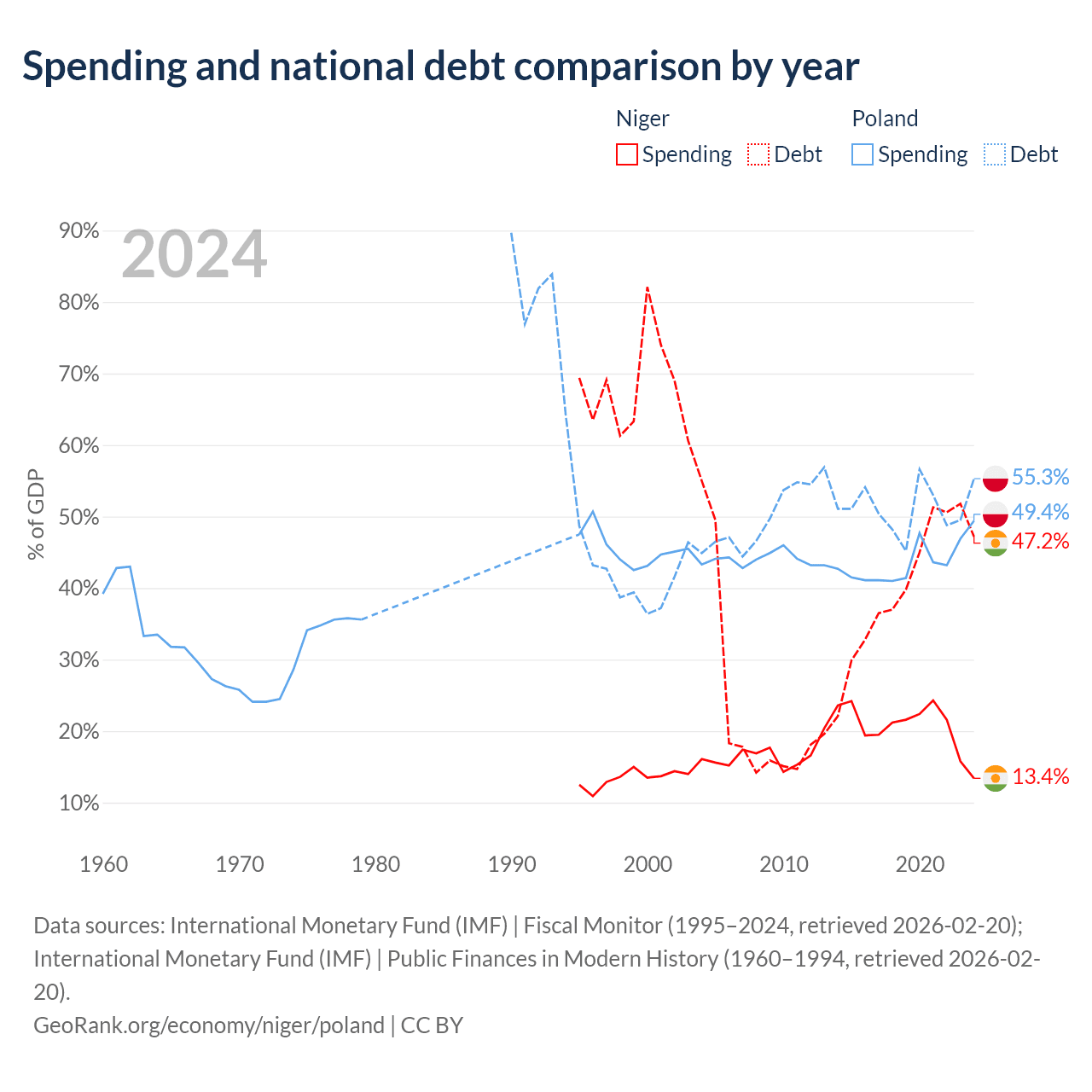 Niger has $9.39B in government debt (47.2% of GDP), compared to $507B (55.3% of GDP) in Poland.