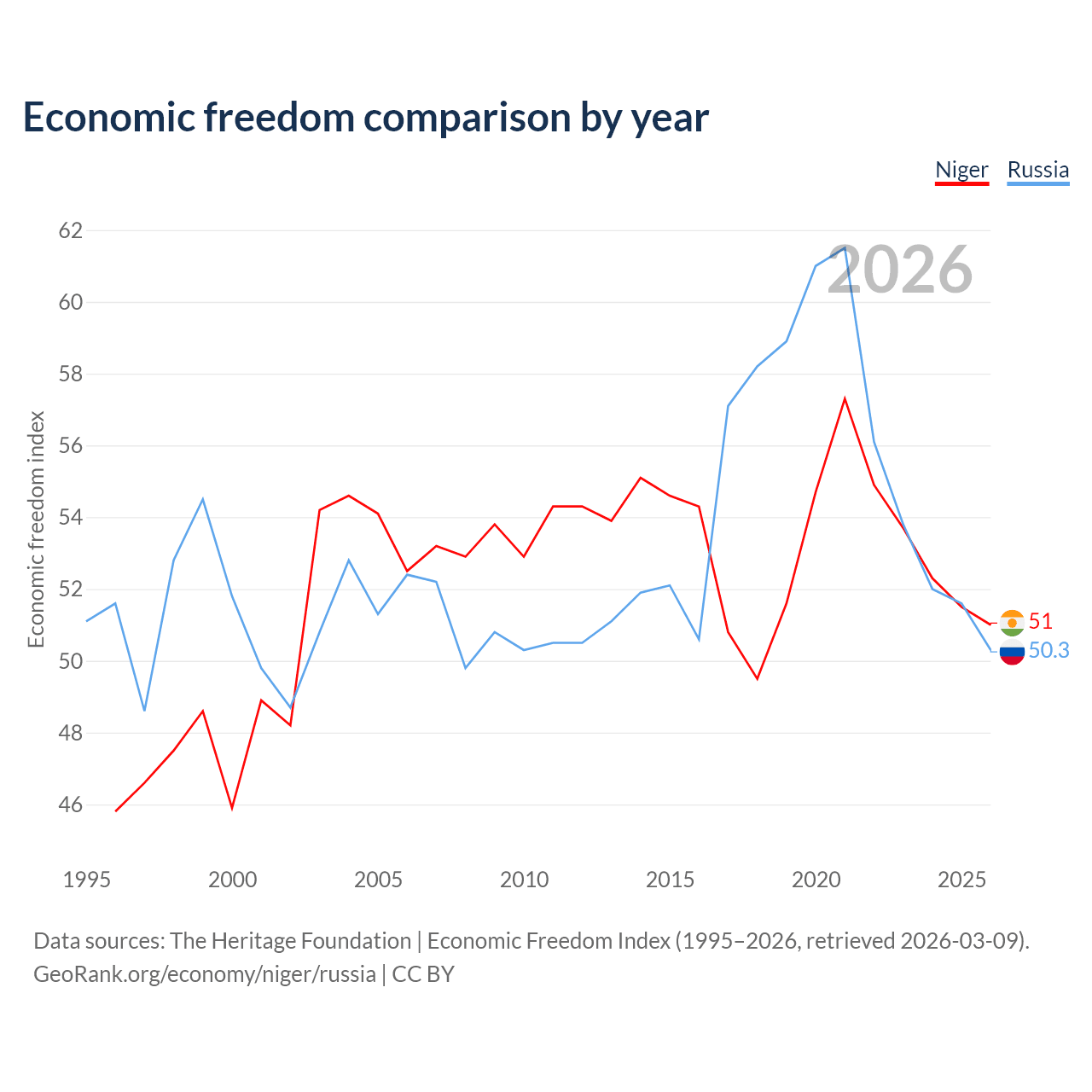 The Economic Freedom Index for Niger is 51, ranking 156/197, compared to 50.3 for Russia, ranking 161/197. The chart above displays a comparison of annual changes in economic freedom indexes.
