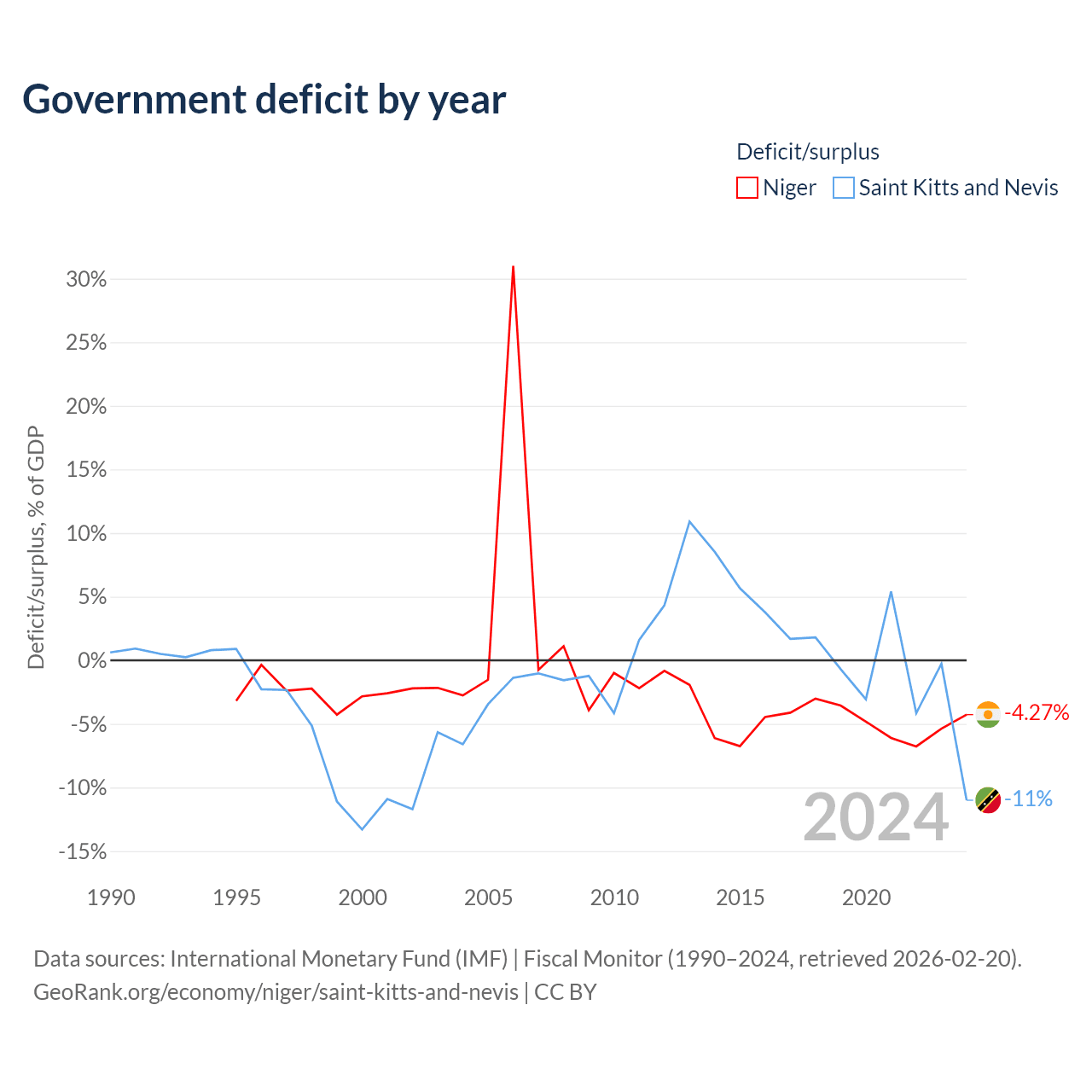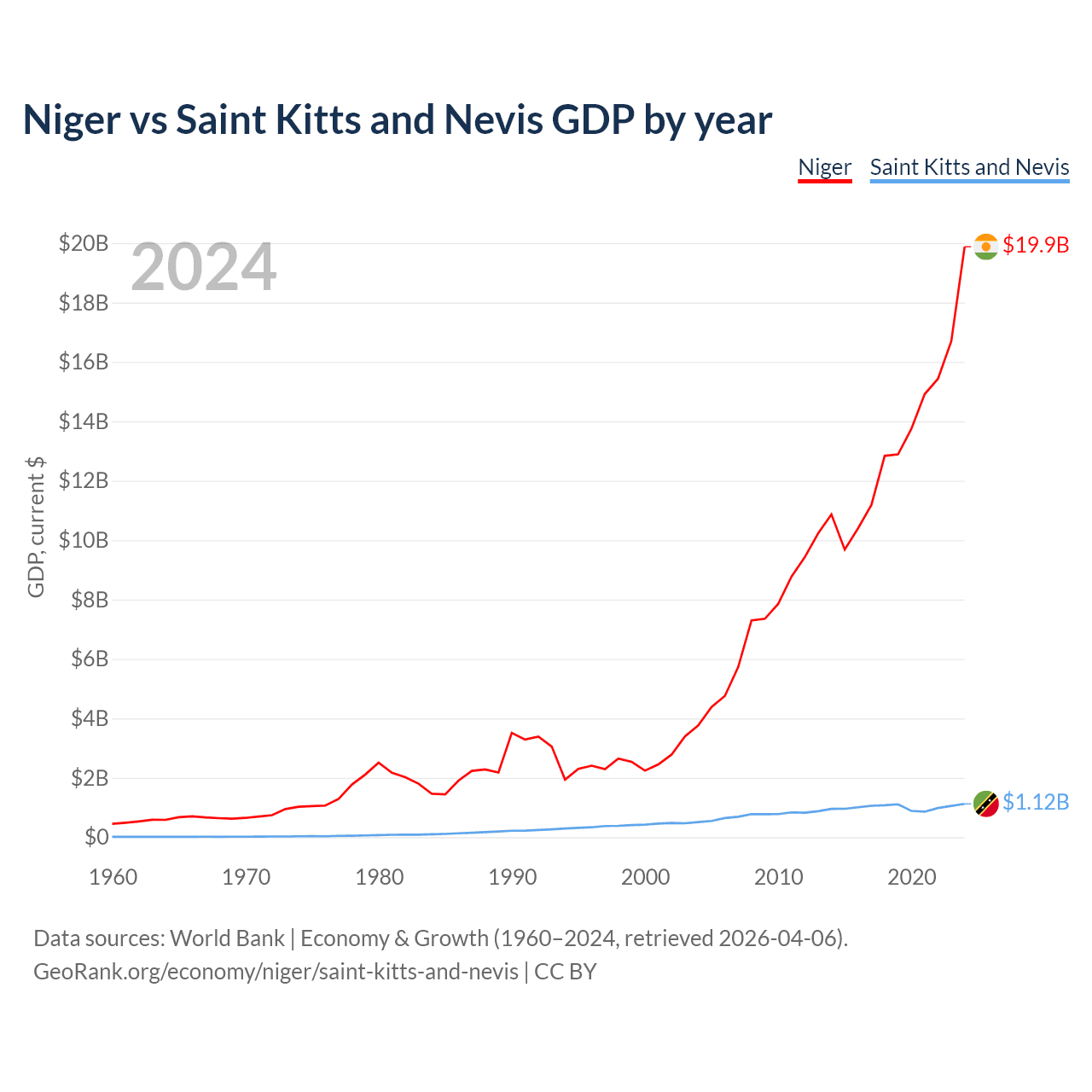 Niger has a GDP of $19.9B compared to $1.12B for Saint Kitts and Nevis, ranking 130/197 and 187/197 by economy size, respectively.