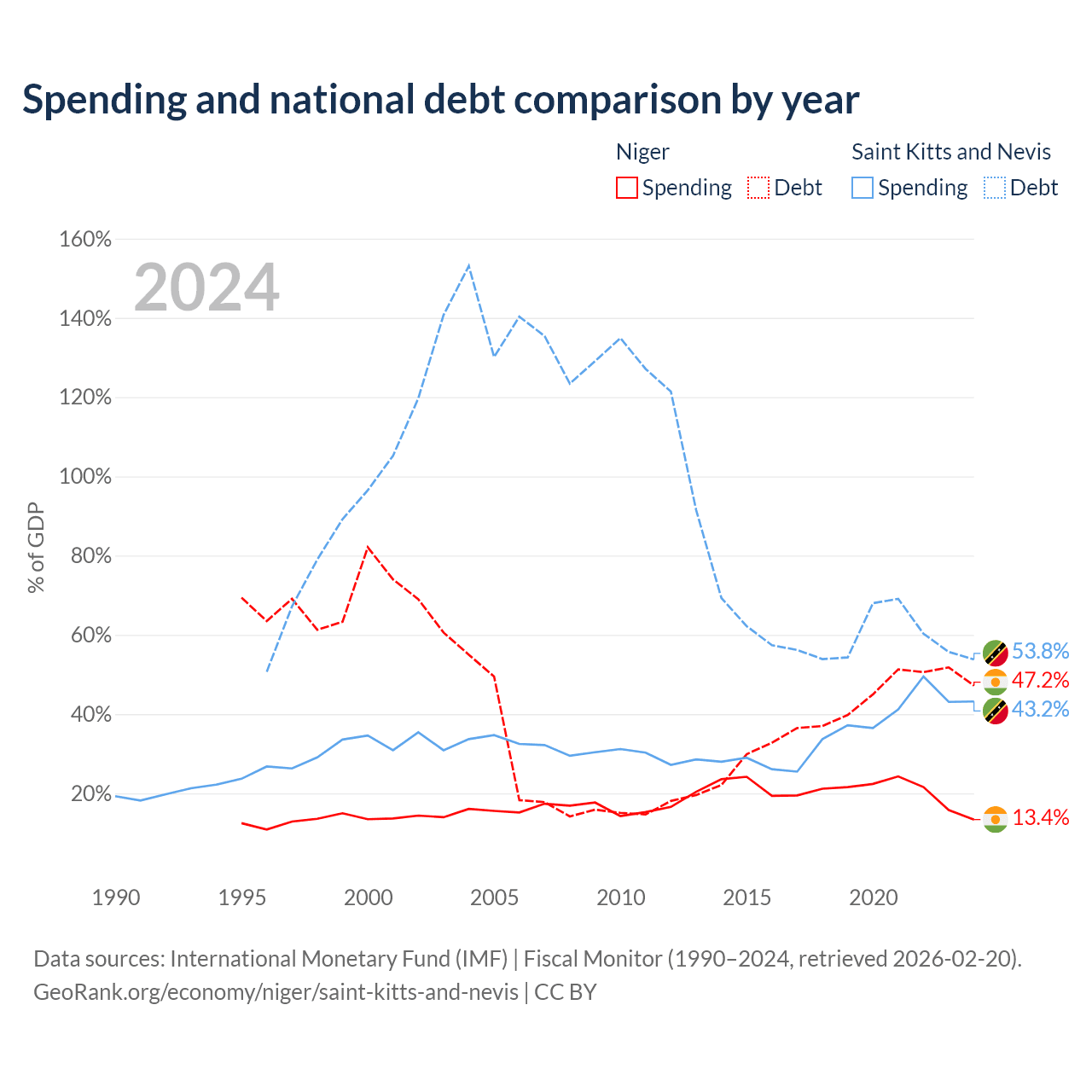 Niger has $9.39B in government debt (47.2% of GDP), compared to $604M (53.8% of GDP) in Saint Kitts and Nevis.