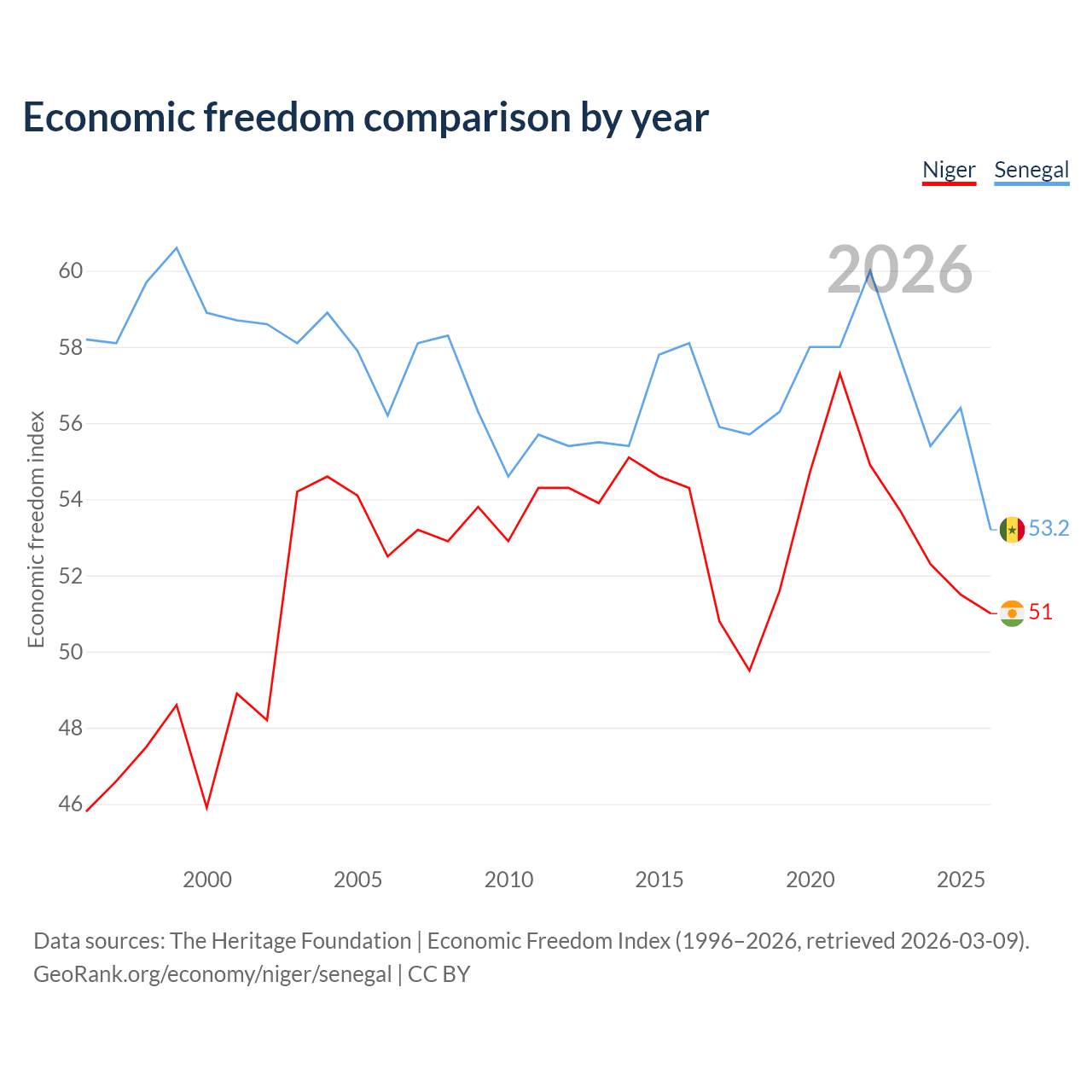 The Economic Freedom Index for Niger is 51, ranking 156/197, compared to 53.2 for Senegal, ranking 140/197. The chart above displays a comparison of annual changes in economic freedom indexes.
