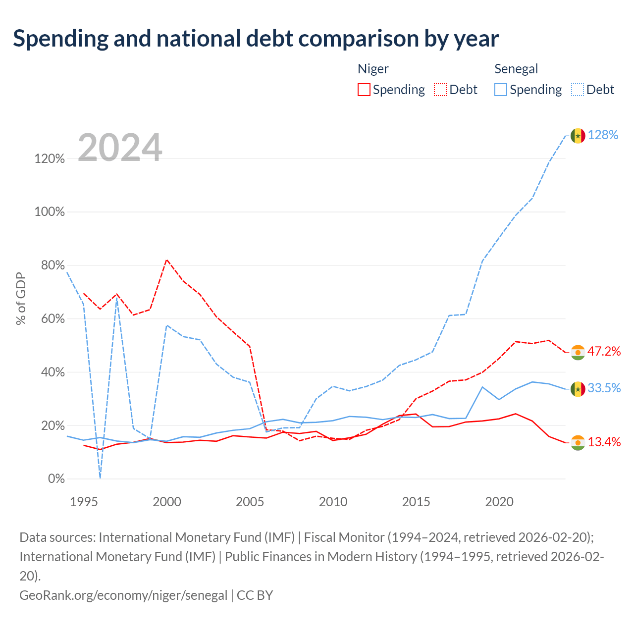 Niger has $9.39B in government debt (47.2% of GDP), compared to $42.1B (128.4% of GDP) in Senegal.