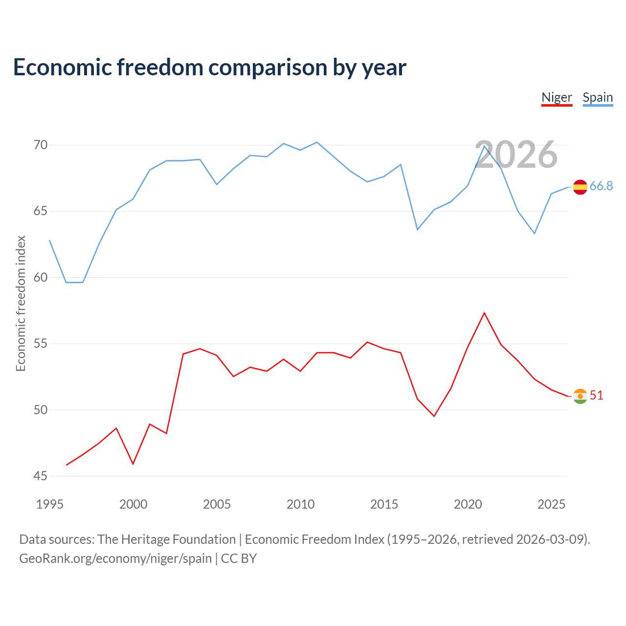 The Economic Freedom Index for Niger is 51, ranking 156/197, compared to 66.8 for Spain, ranking 59/197. The chart above displays a comparison of annual changes in economic freedom indexes.