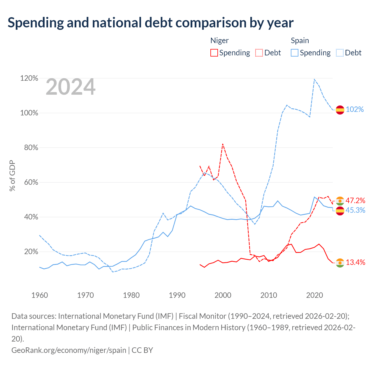 Niger has $9.39B in government debt (47.2% of GDP), compared to $1.75T (101.6% of GDP) in Spain.
