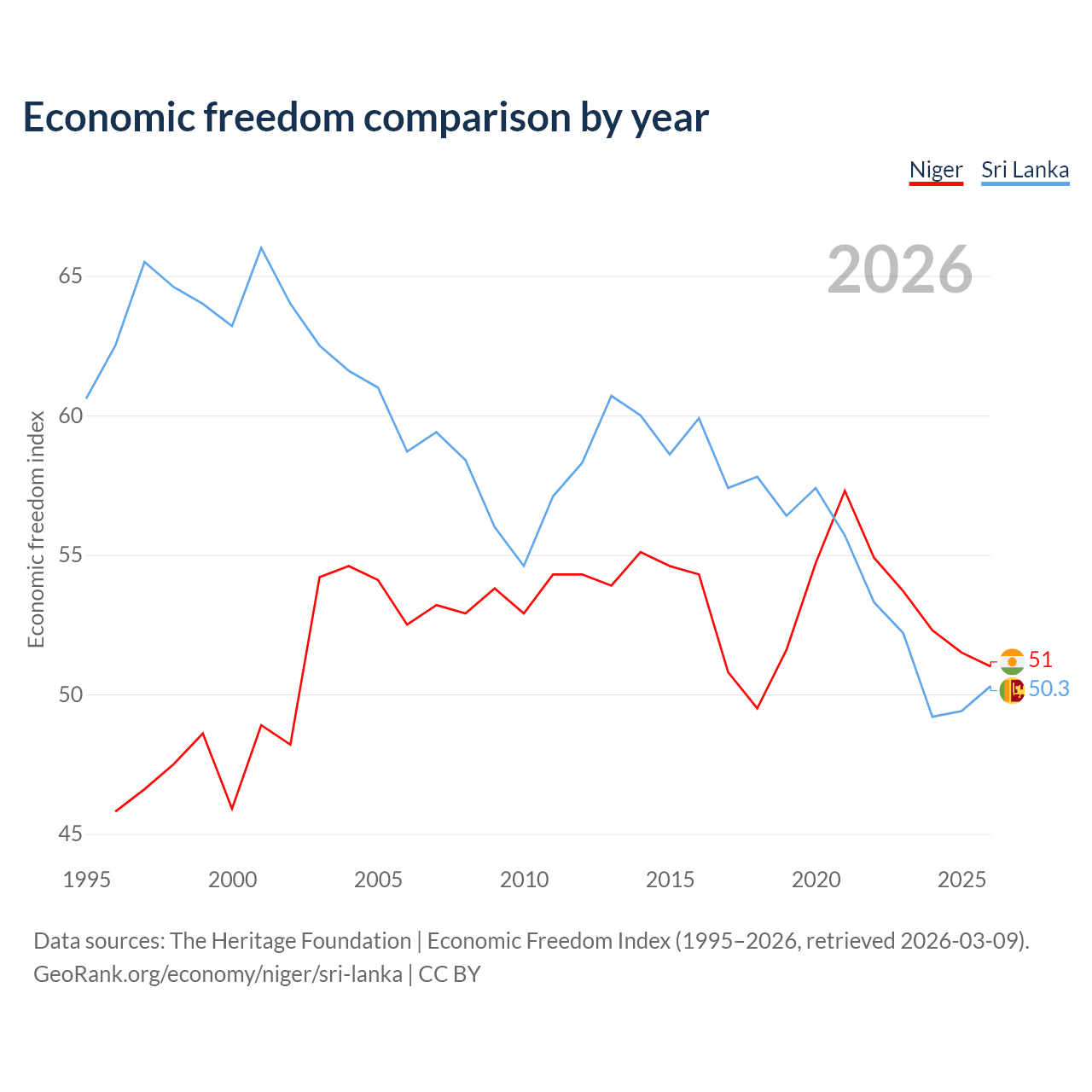 The Economic Freedom Index for Niger is 51, ranking 156/197, compared to 50.3 for Sri Lanka, ranking 162/197. The chart above displays a comparison of annual changes in economic freedom indexes.