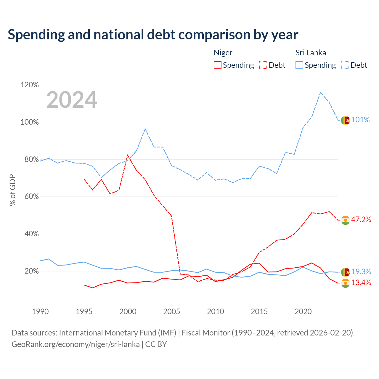 Niger has $9.39B in government debt (47.2% of GDP), compared to $99.8B (100.8% of GDP) in Sri Lanka.