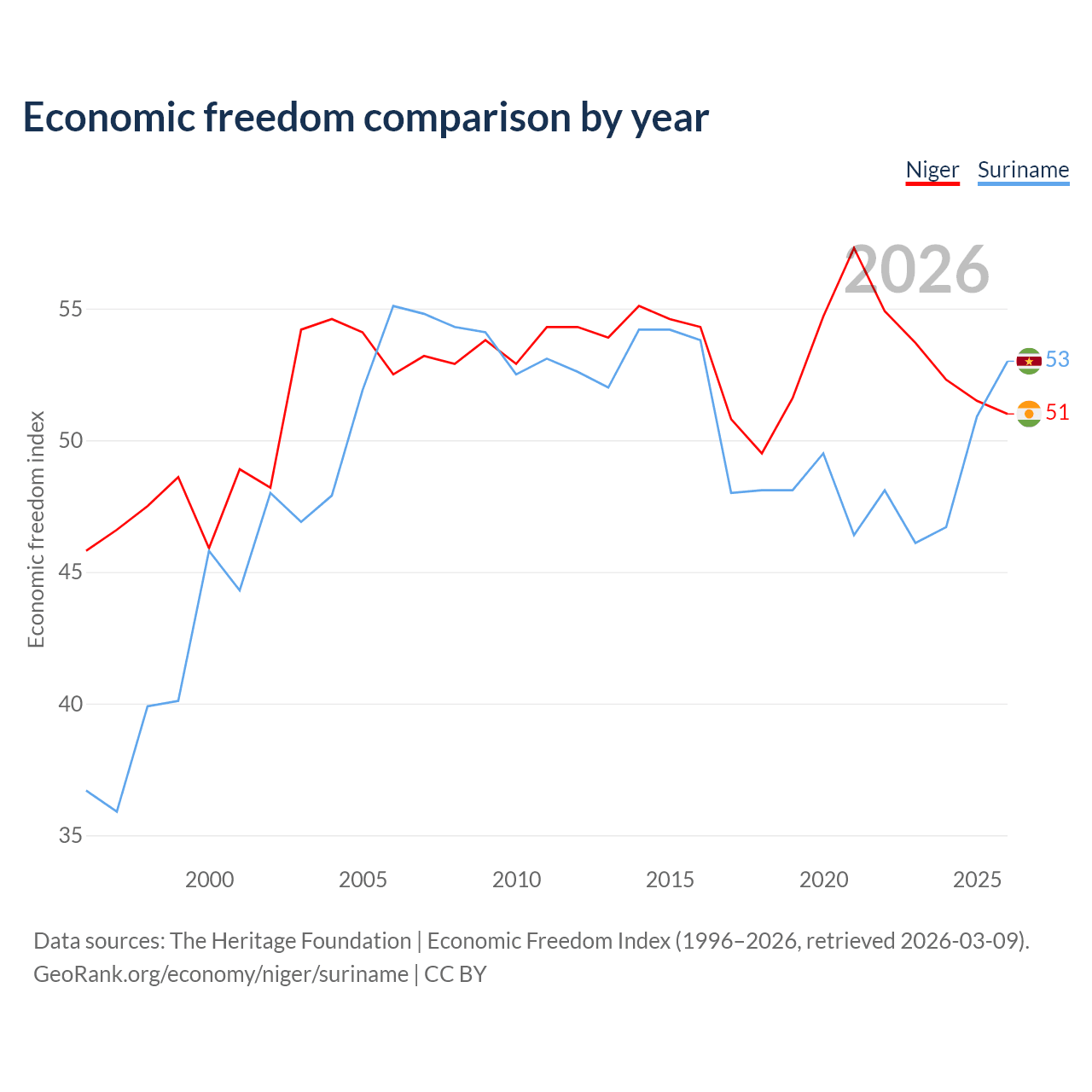 The Economic Freedom Index for Niger is 51, ranking 156/197, compared to 53 for Suriname, ranking 143/197. The chart above displays a comparison of annual changes in economic freedom indexes.