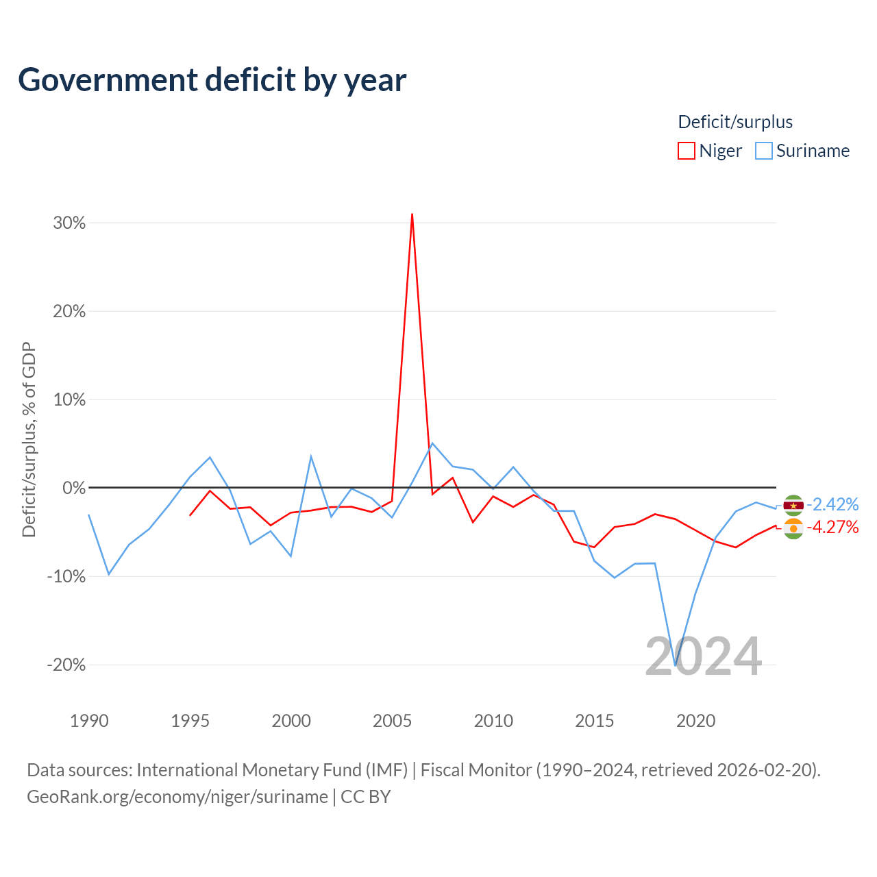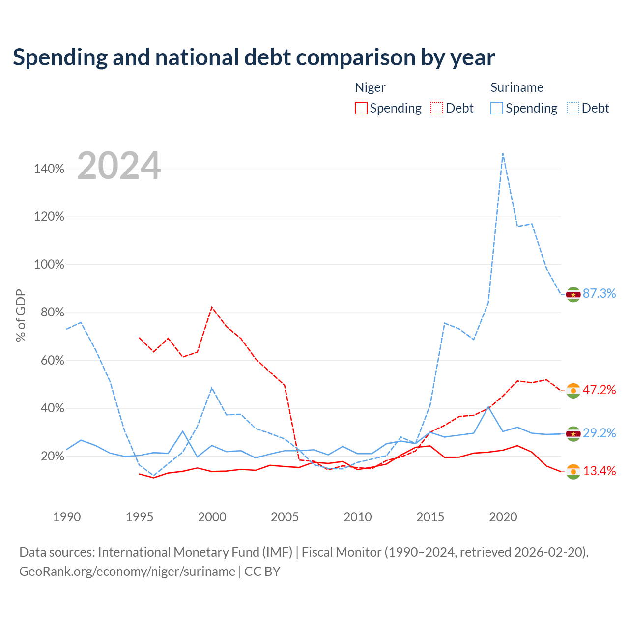 Niger has $9.39B in government debt (47.2% of GDP), compared to $3.86B (87.3% of GDP) in Suriname.