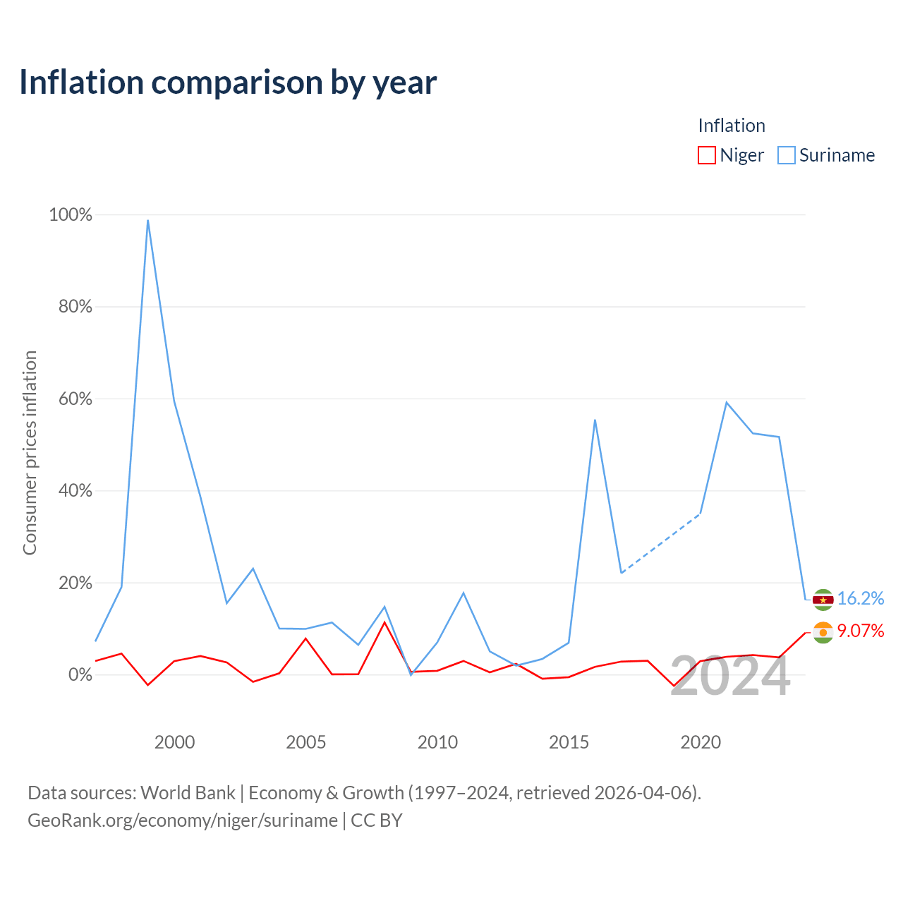 Niger has a GDP of $19.9B compared to $4.42B for Suriname, ranking 130/197 and 164/197 by economy size, respectively.