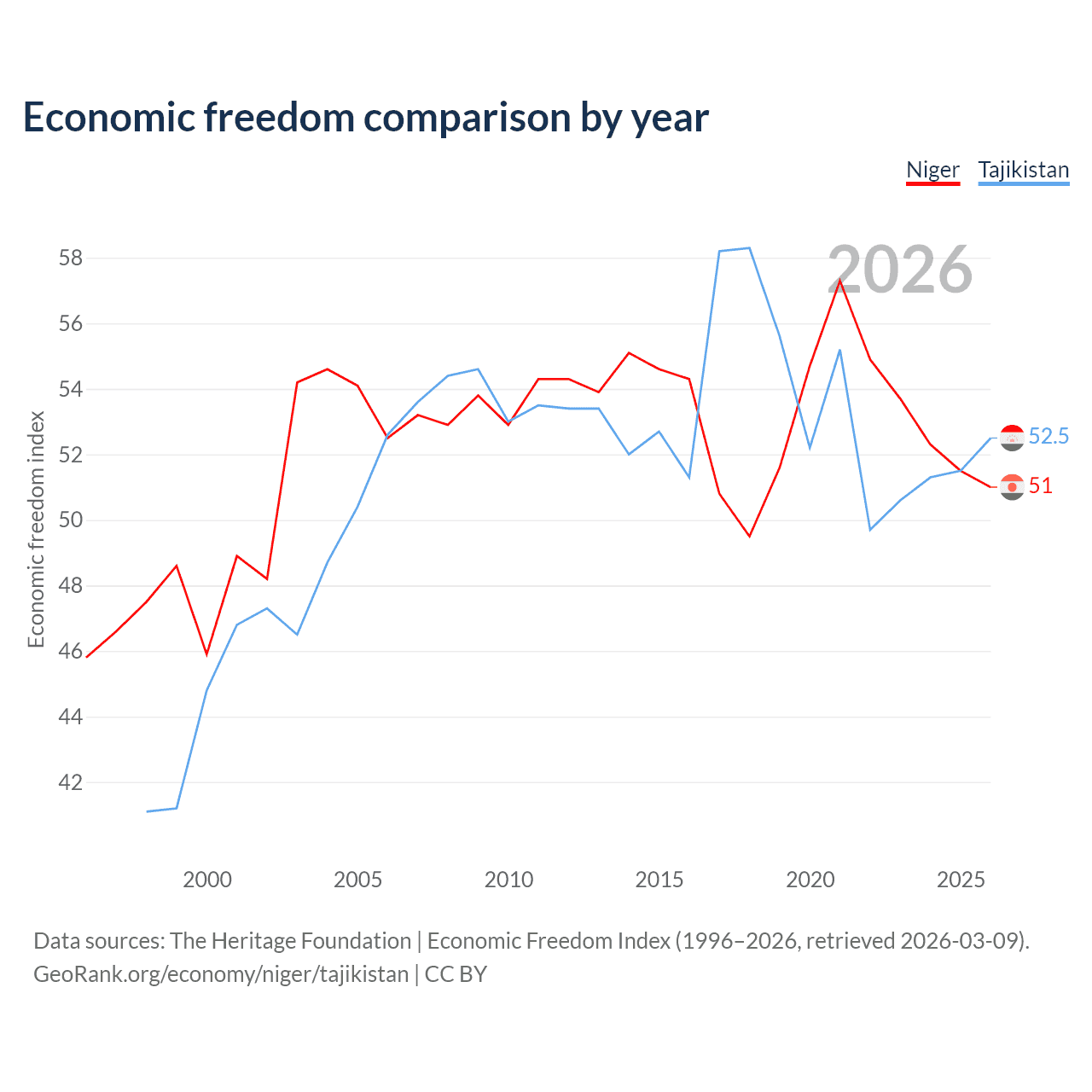 The Economic Freedom Index for Niger is 51, ranking 156/197, compared to 52.5 for Tajikistan, ranking 147/197. The chart above displays a comparison of annual changes in economic freedom indexes.