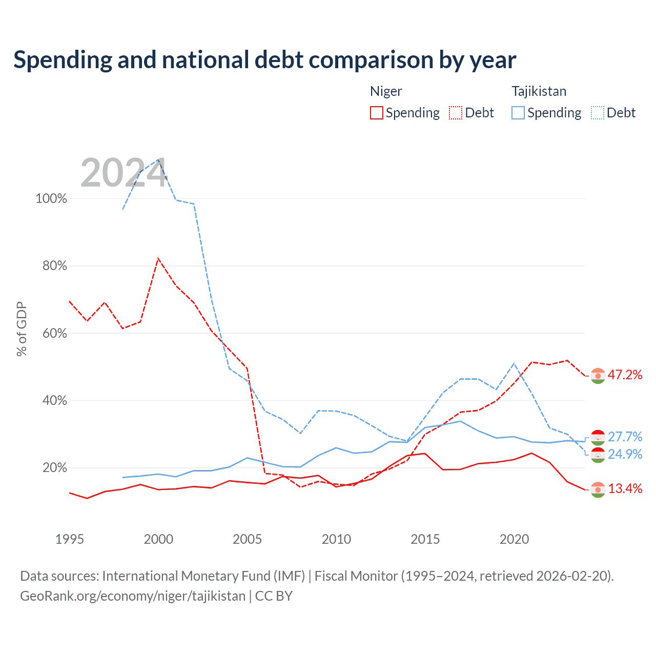 Niger has $9.39B in government debt (47.2% of GDP), compared to $3.54B (24.9% of GDP) in Tajikistan.